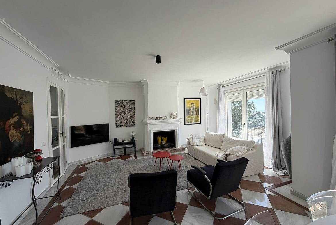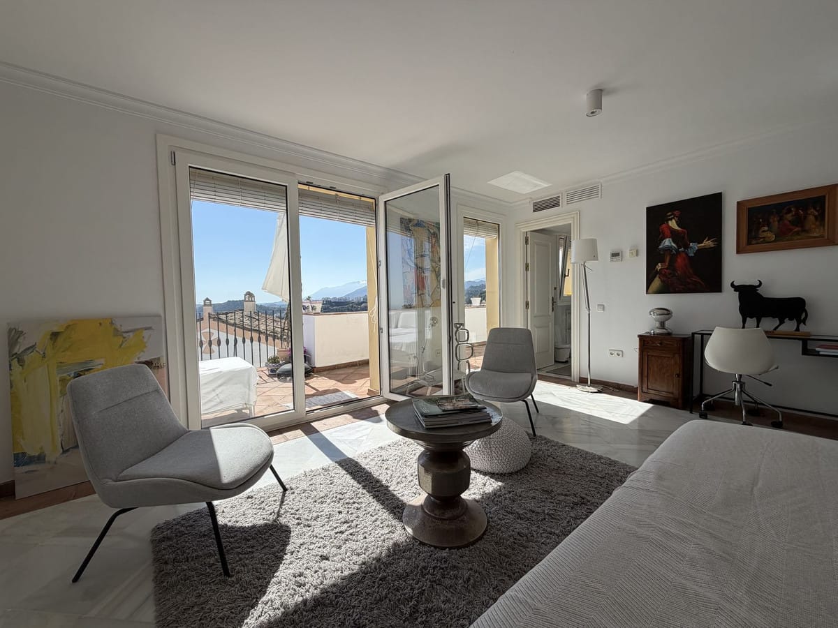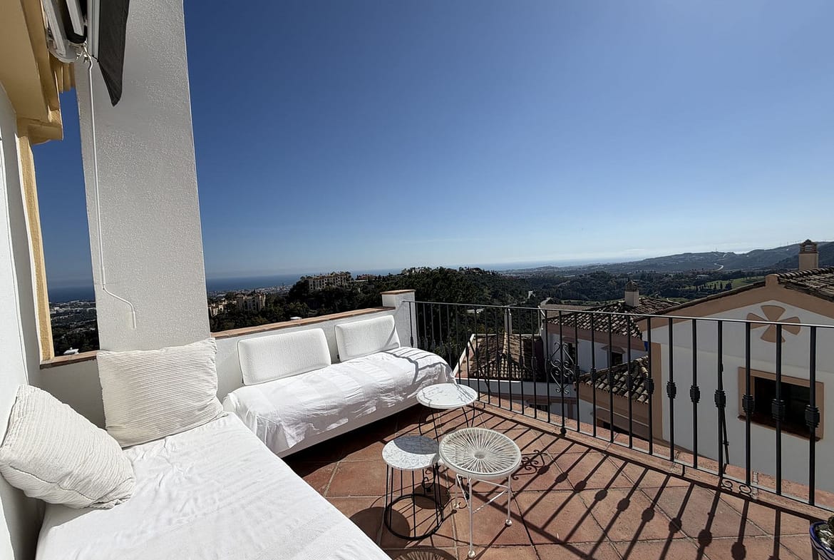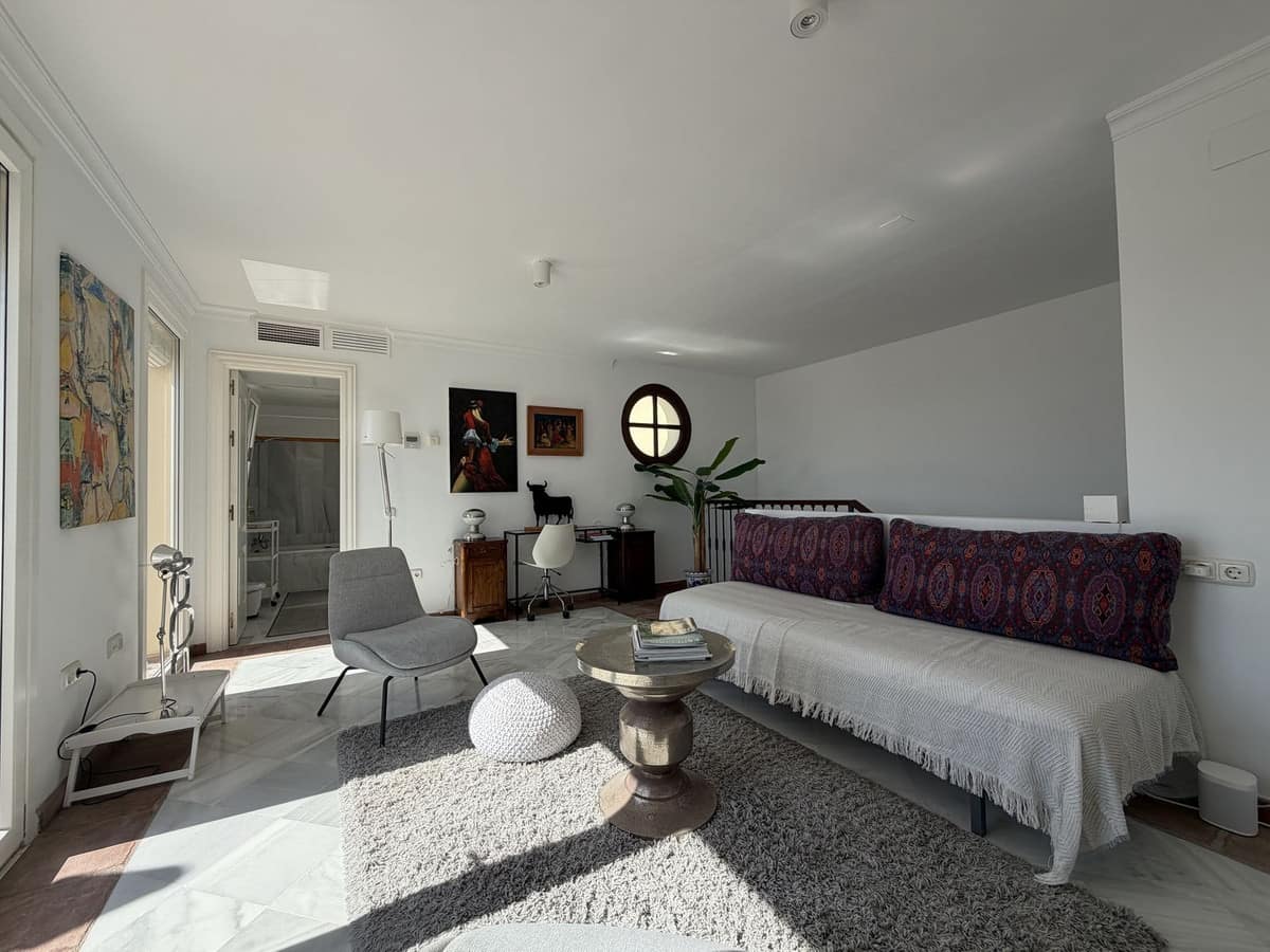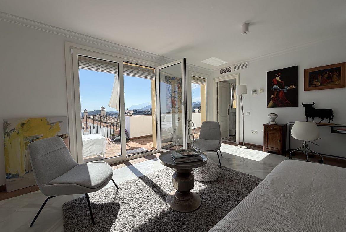 On the upper floor, you’ll find the third bedroom, currently used as a lounge and workspace, offering flexibility to suit your needs. From here, you step out onto the spacious rooftop terrace, where you can truly enjoy the lifestyle this property offers. With panoramic views over Marbella, Puerto Banús, the sea, Gibraltar and even the Moroccan coastline, this is the perfect place to relax and watch the sunset.
