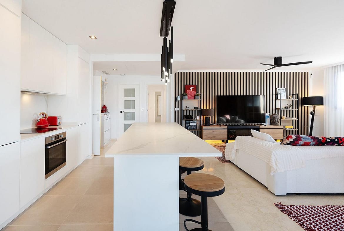 This spectacular renovated house, with its elegant contemporary style, offers a total of three bedrooms with three bathrooms, plus an office area, and a large living room of over 50m2 with an integrated kitchen.