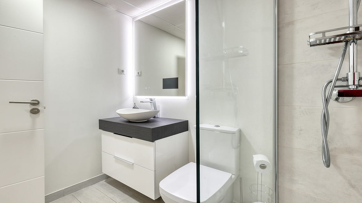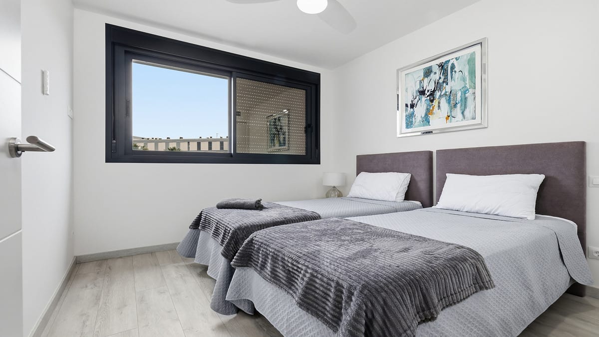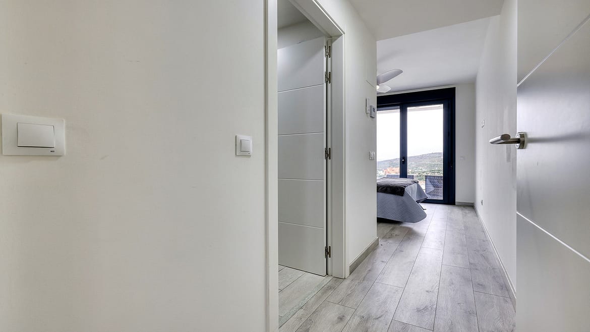 The level below the solarium is dedicated to the sleeping accommodation and offers three bedrooms. The master bedroom is generous in size and benefits from an ensuite bathroom with shower, along with a private balcony where you can sit back and enjoy the sea views. Two further double bedrooms are fitted with built in wardrobes and blinds, with a modern family bathroom featuring a walk in shower positioned between them.