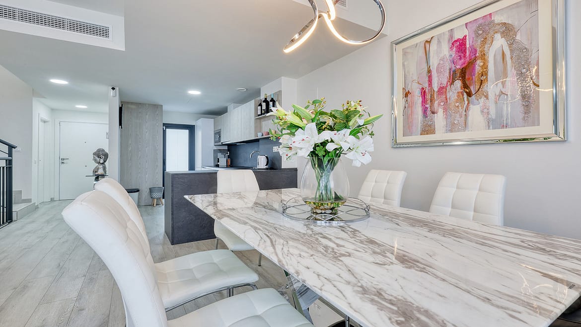 This stylish three bedroom townhouse is set within the popular Golden View I development, an elevated residential community known for its open sea views that stretch all the way to Gibraltar and the coast of Morocco. Thanks to its southwest facing orientation, the property enjoys plenty of natural light and beautiful sunsets throughout the year.