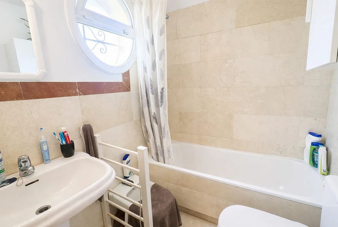Upstairs, a feature mezzanine leads to three double bedrooms, all with fitted wardrobes. The master bedroom benefits from a full en-suite bathroom and access to a private terrace with panoramic views of the coastline. A second bathroom serves the remaining bedrooms. Additional features include marble flooring throughout, hot and cold air conditioning, and an integrated alarm system.
