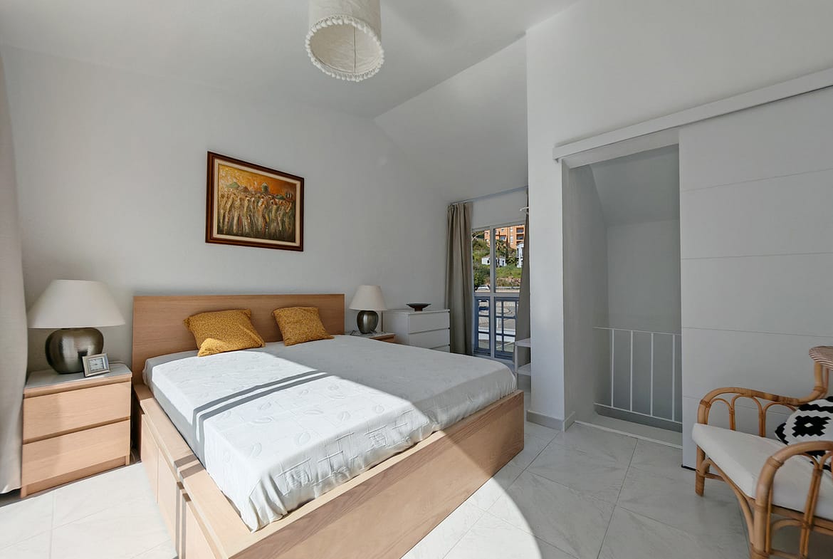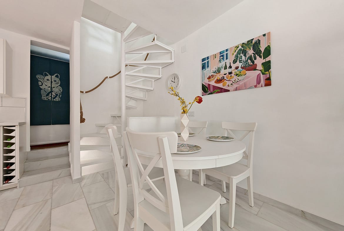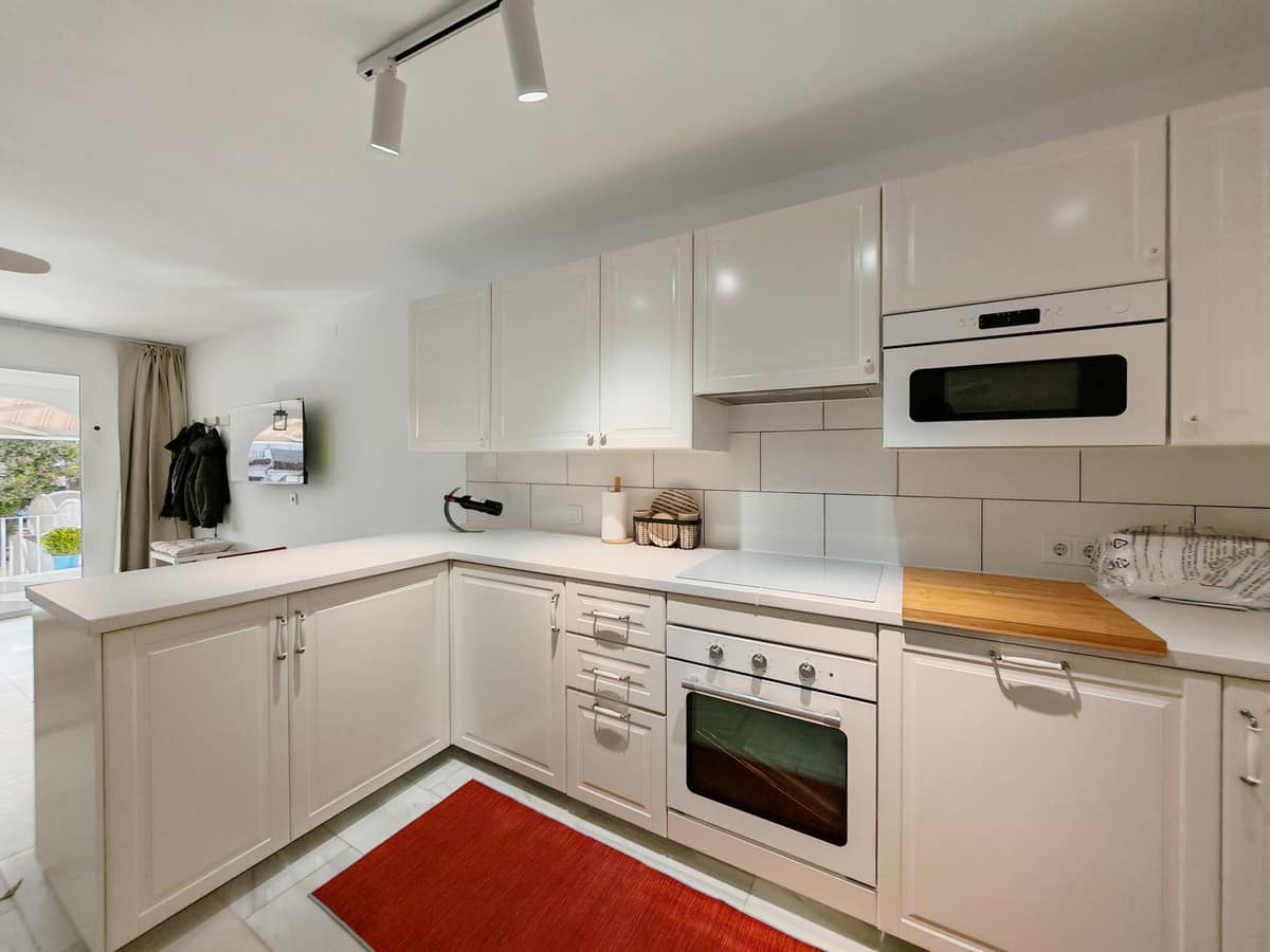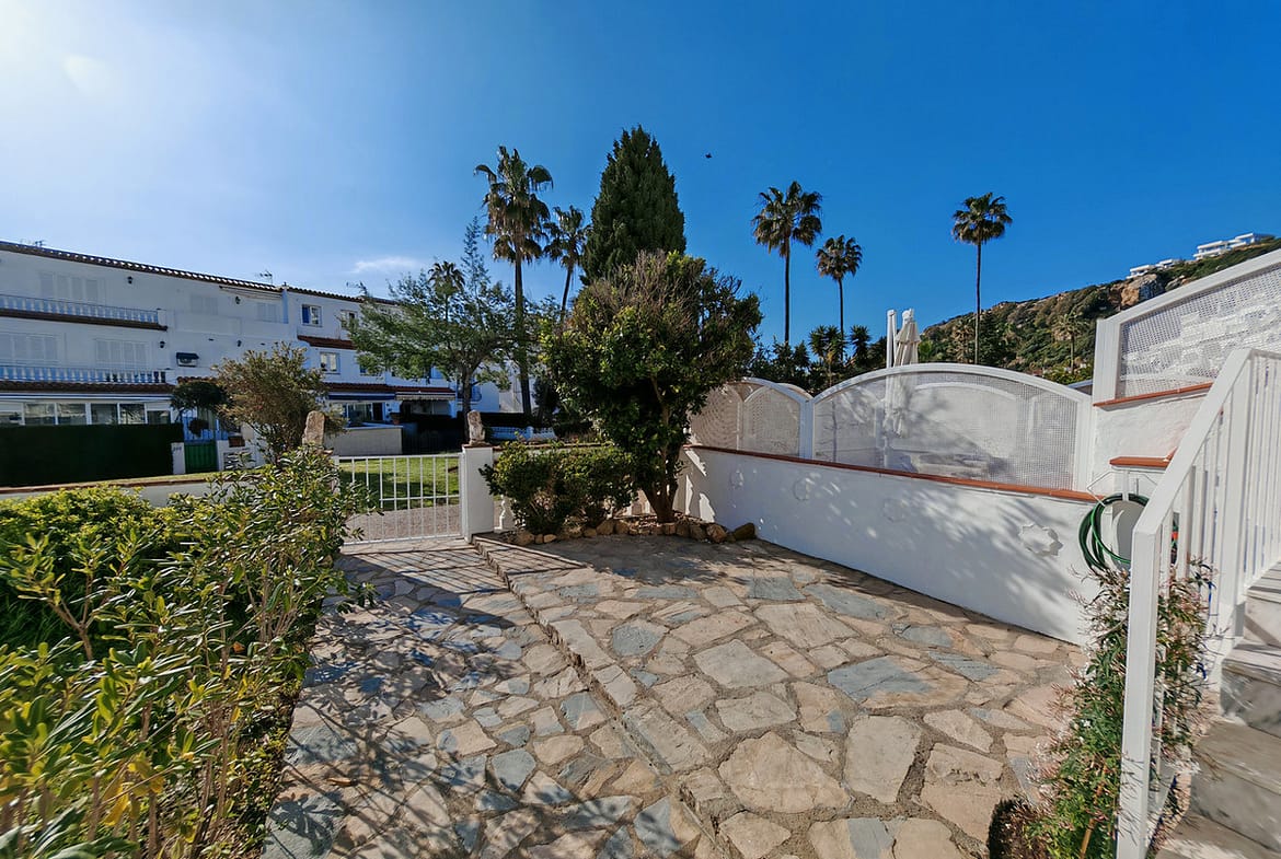 Town House for sale in , Manilva with 3 bedrooms, 2 bathrooms and with orientation south/east, with communal swimming pool, private garage (1 parking spaces) and private garden. Regarding property dimensions, it has 142 m² built and 25 m² terrace. Has the following facilities front line beach, amenities near, transport near, air conditioning, fully furnished, fully fitted kitchen, utility room, marble floors, basement, security entrance, double glazing, guest toilet, private terrace, living room, covered terrace, gated community, garden view, beach side, close to children playground, close to sea / beach, close to golf, uncovered terrace, games room, glass doors, balcony, excellent condition, recently renovated / refurbished, close to shops, close to town, pets allowed, partial sea views, direct sea access and close to restaurants.