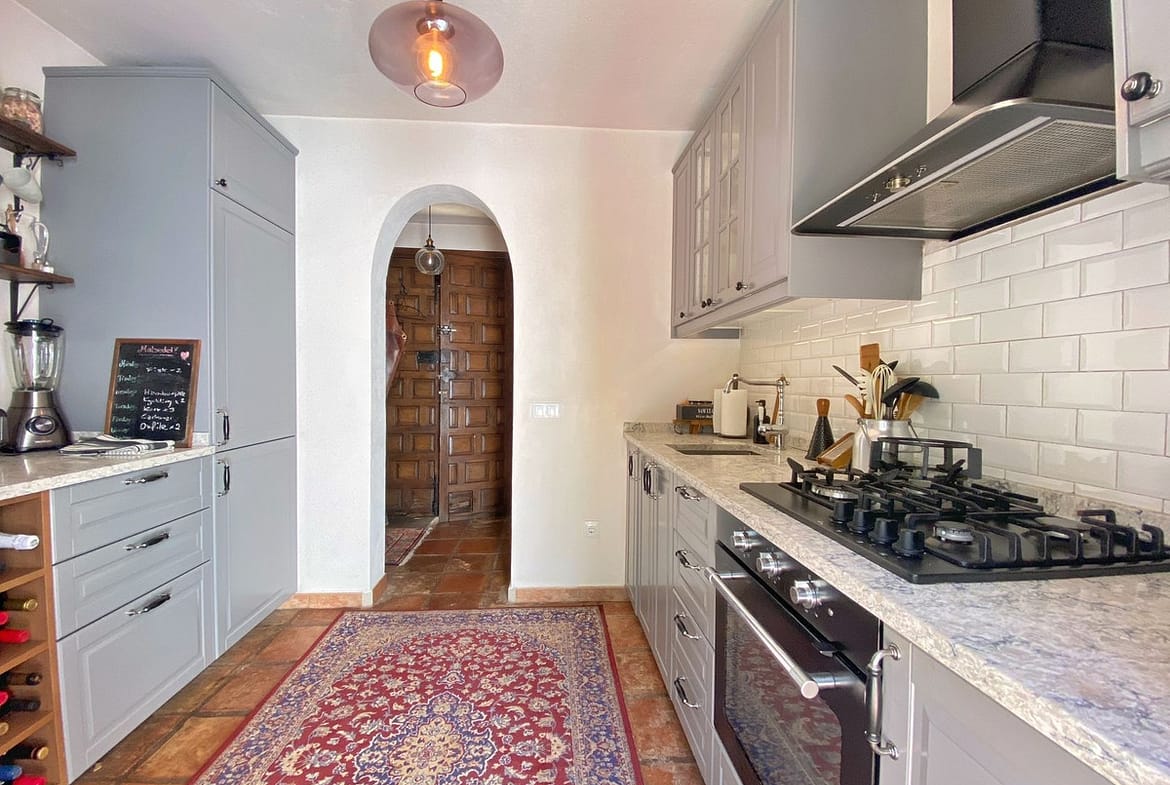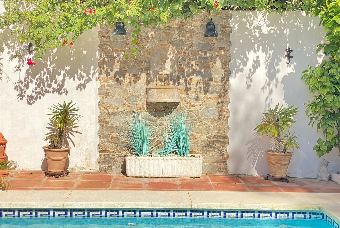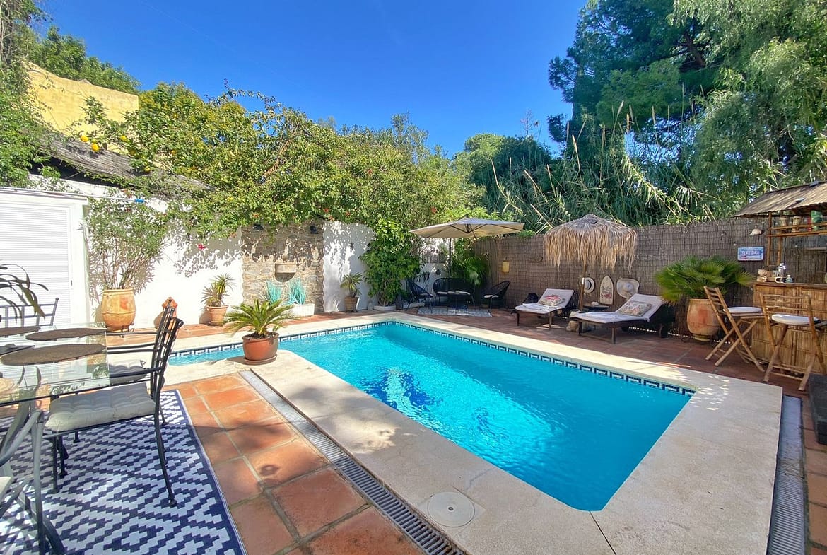 Around the pool is a chill-out area with sun loungers, an outdoor kitchen with a barbecue, and a bar area. Traditional elements such as terracotta floors, solid wood doors and windows, and beamed ceilings characterize the architecture of this charming house.