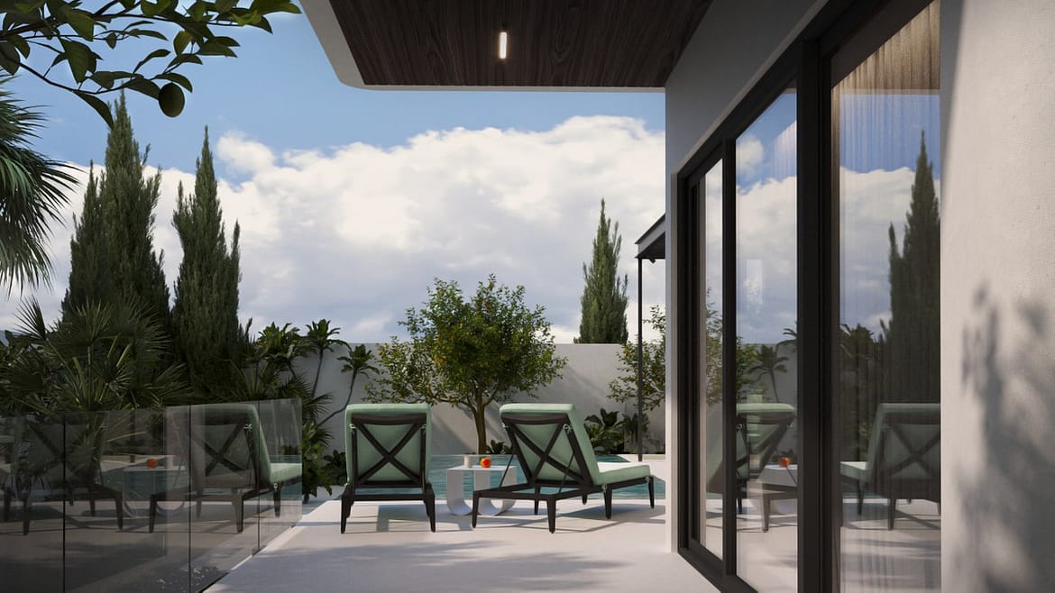 Bright living room with access to the garden and private pool (approximately 3 x 8 m).