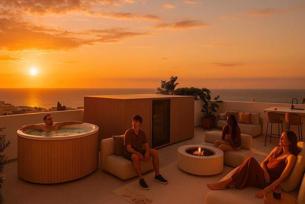 Step into resort-style living: a sparkling communal pool set among manicured gardens, plus your own private rooftop solarium with breathtaking Mediterranean views.
