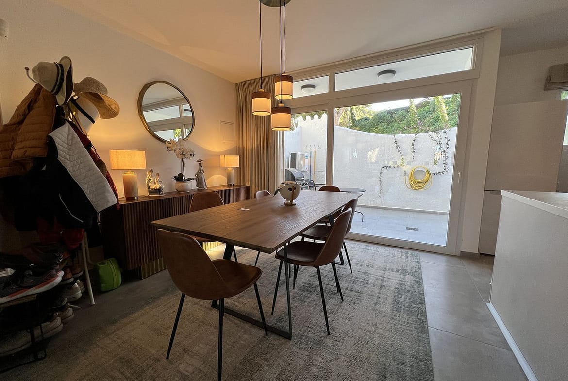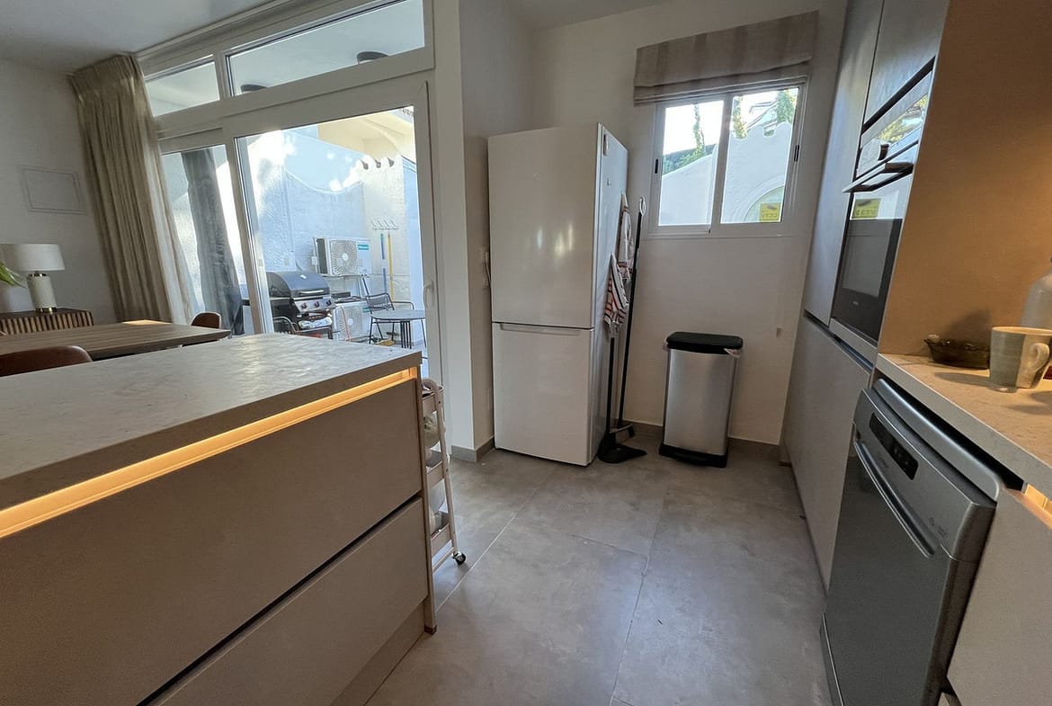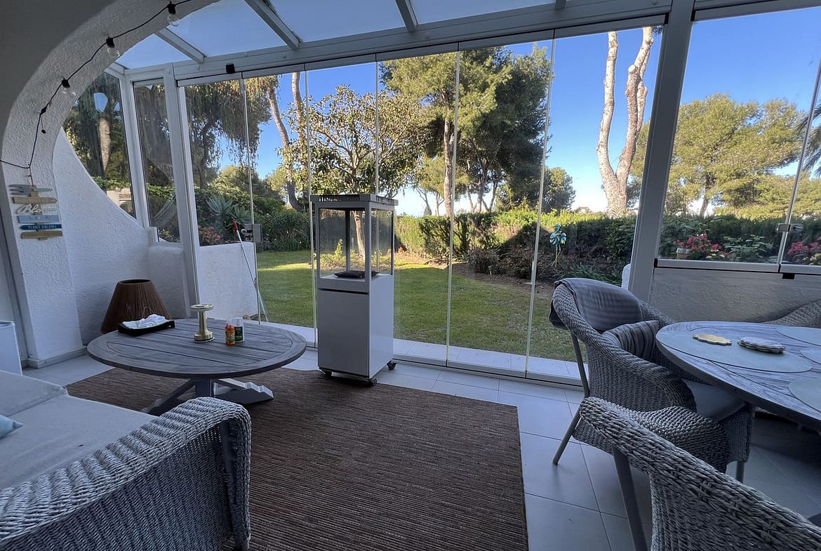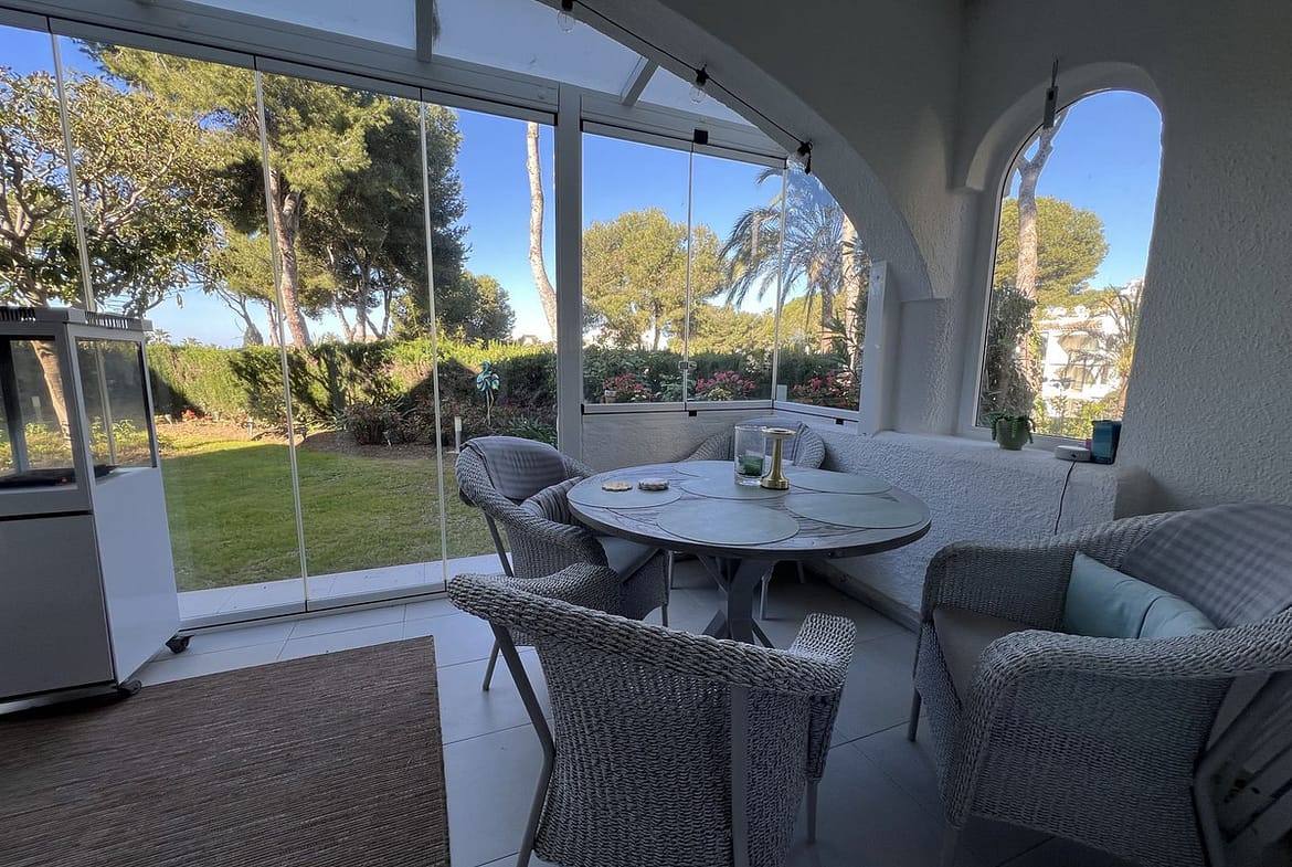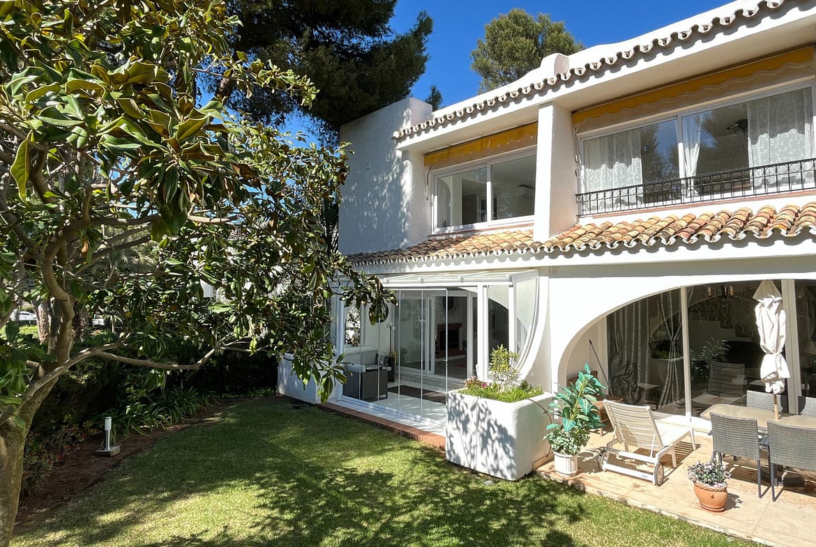 This gorgeous semi detached house in Miraflores will stun you with its tasteful interior updates and yet it still maintains it's Spanish feel. The ground floor welcomes you with a bright, large lounge, dining area and open plan kitchen. There is lots of natural light pouring in from both sides of the house plus you have the use of the private terrace on the east side, ideal for having breakfast in the morning sun. The lounge leads onto the westerly terrace which has been enclosed using glass curtains giving you even more living space and then access onto the garden area which is shared by only one other house. Other features on the ground floor include a brand new kitchen, gas living flame fireplace plus a guest cloakroom. Upstairs is where you will find the huge main bedroom with en-suite bathroom plus walk-in wardrobe. You also have two additional double bedrooms and a shared family bathroom. There is hot and cold air conditioning throughout the house plus owners have the use of the stunning communal swimming pools and you are only a stone's throw from the Miraflores tennis club. Owners have the use of two communal swimming pools and off-street parking. You will not be disappointed