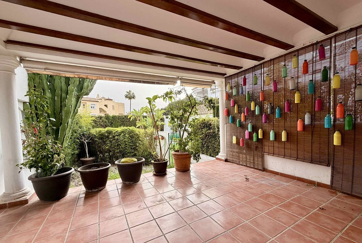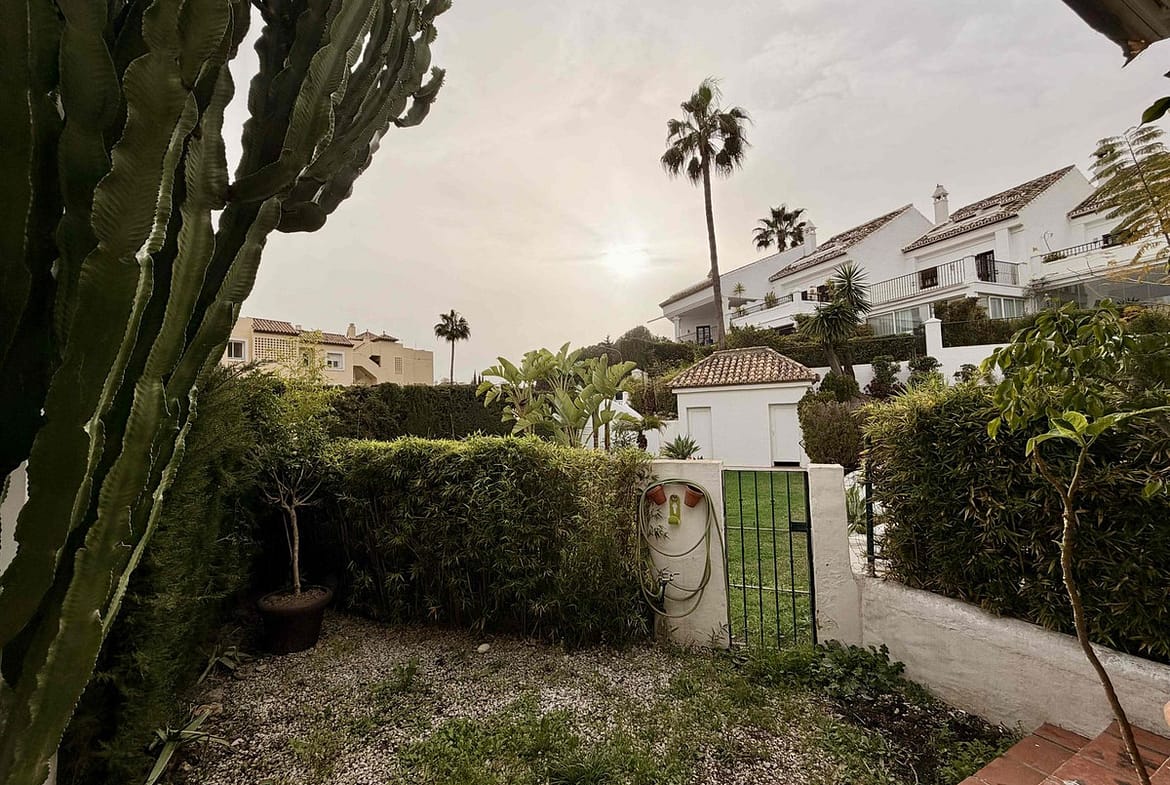 Exclusive townhouse in a gated Andalucian style community with two pools, lush mature gardens and excellent location in Nagueles, above the Golden Mile of Marbella.