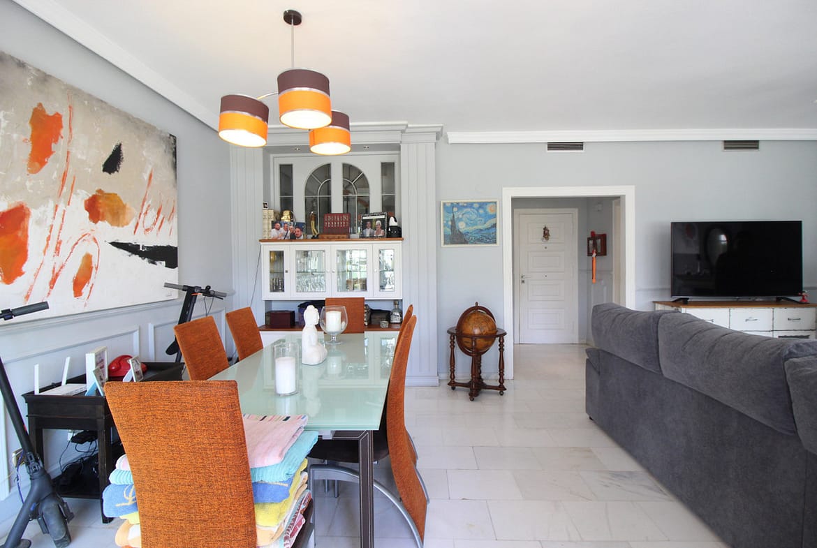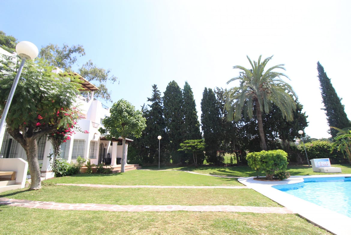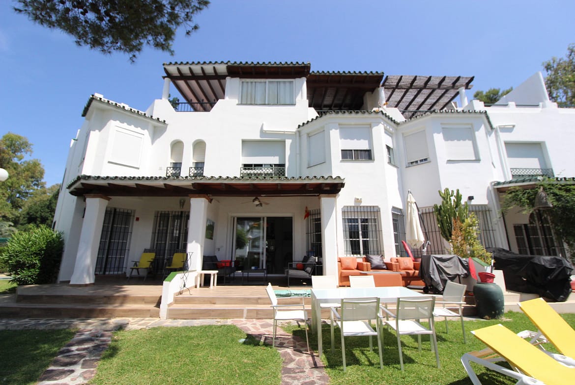 Enjoy the communal garden from the lounge porch! On the first floor are the 3 bedrooms and 2 bathrooms, one of them en suite with shower and large dressing area. New wardrobes in all bedrooms . It is a closed and very well maintained community. The house has several Porches, and huge Solárium with a wooden roof recently put so this new one. Ideal for chill out area and outdoor dinners with barbecue and closed part as well as laundry room. The fantastic panoramic views of the whole wooded area and the mountains of La Quinta. The urbanization is close to everything: Supermarkets, Colleges, Shops, Restaurants etc.. is ideal for Holidays or for families. And perfect to live all year. It has general air conditioning throughout the house and blinds. San Pedro de Alcántara is a 4-minute drive from Puerto Banus. It is for all an ideal house for families and also for investment and enjoy Marnbella with everything next to it;