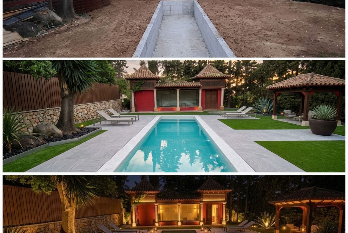The home features a private garden and a swimming pool currently under construction, measuring approximately 11 meters long by 3 meters wide. The images include renderings showing what the exterior will look like once completed, allowing you to visualize the property’s great potential.