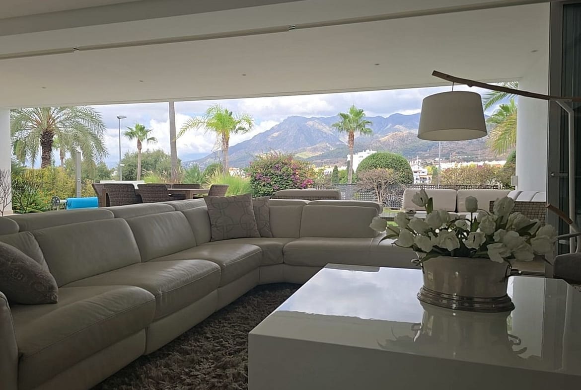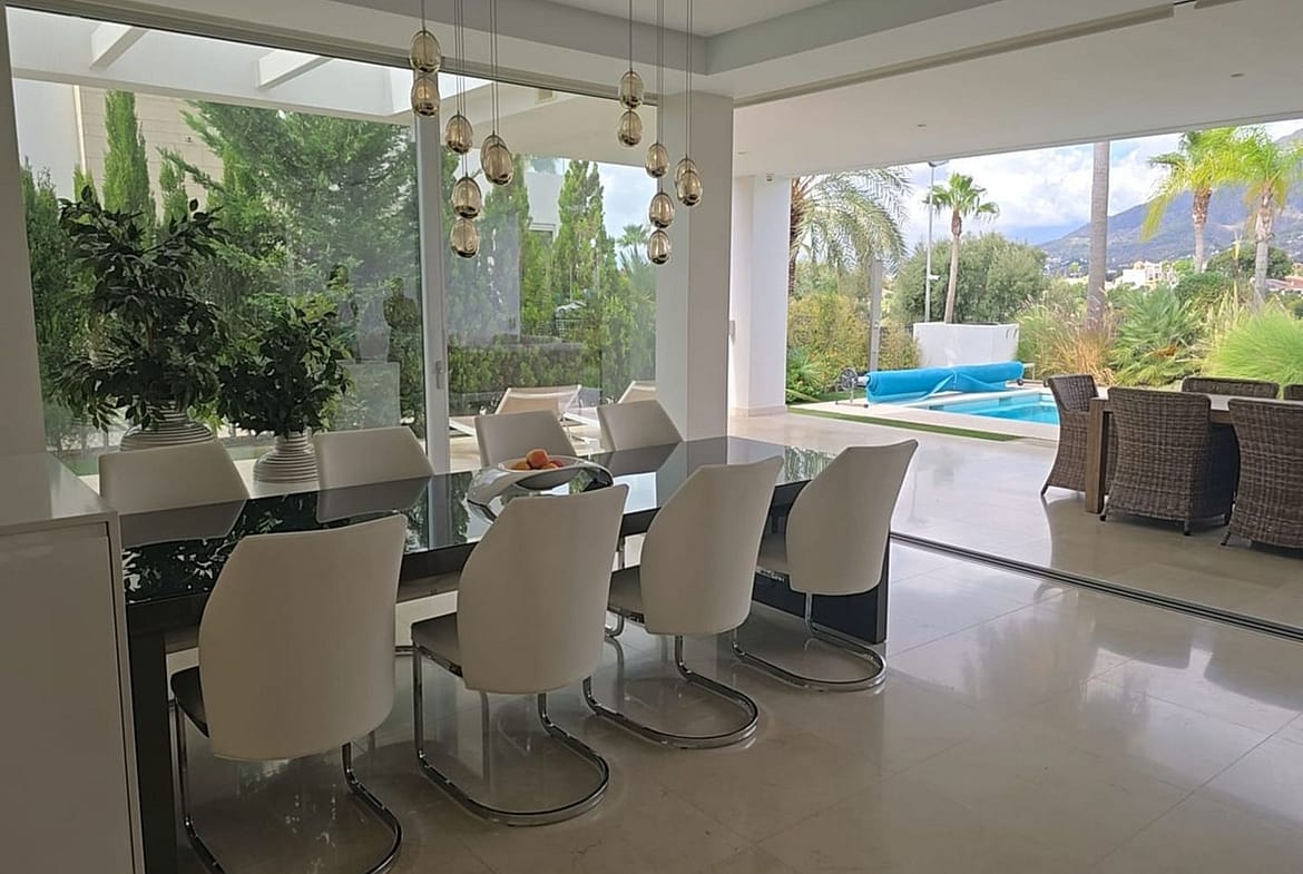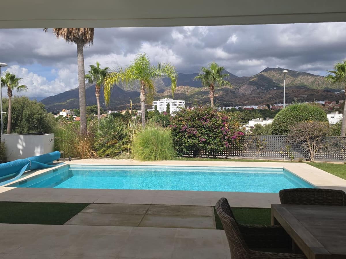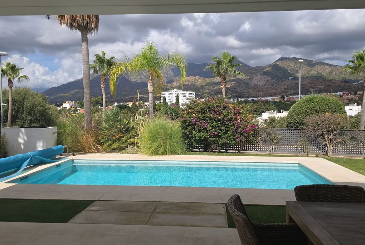 This luxurious modern villa is located in the residential community of Río Real “La Finca de Marbella”, 15 minutes walk from the beach (“Trocadero Arena” restaurant), 5 minutes by car from the center of Marbella and 15 minutes from Puerto Banús. The 3-bedroom villa is made up of two levels, 2 bedrooms on the second floor with a large terrace with spectacular mountain-, city- and partly sea views and 1 bedroom on the ground floor. Each room is equipped with elegant furniture and a private bathroom. The ground floor offers a large living and dining area connected to the open plan kitchen. The floor-to-ceiling windows allow the interior and exterior areas to be integrated, making it especially pleasant. The villa has its own private heated pool, closed private parking for 2 cars and tropical plants throughout the garden. Underfloor heating, air conditioning, alarm system and cameras, all for the comfort of living.