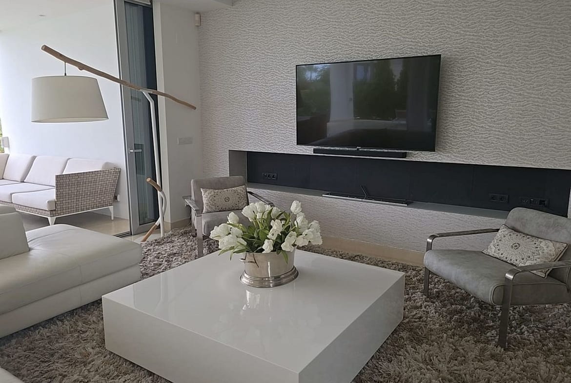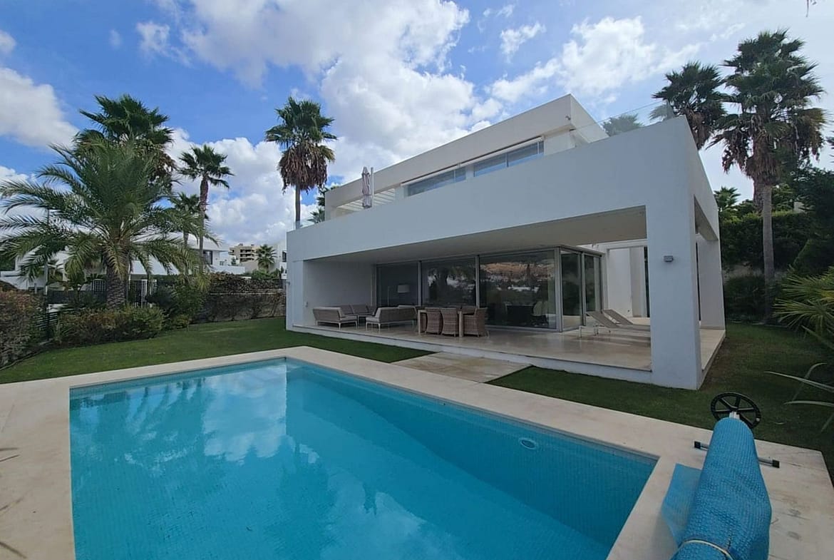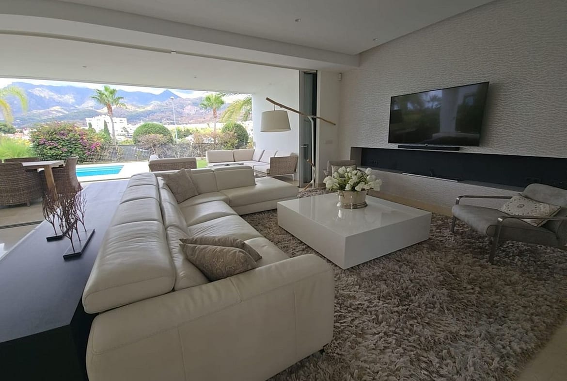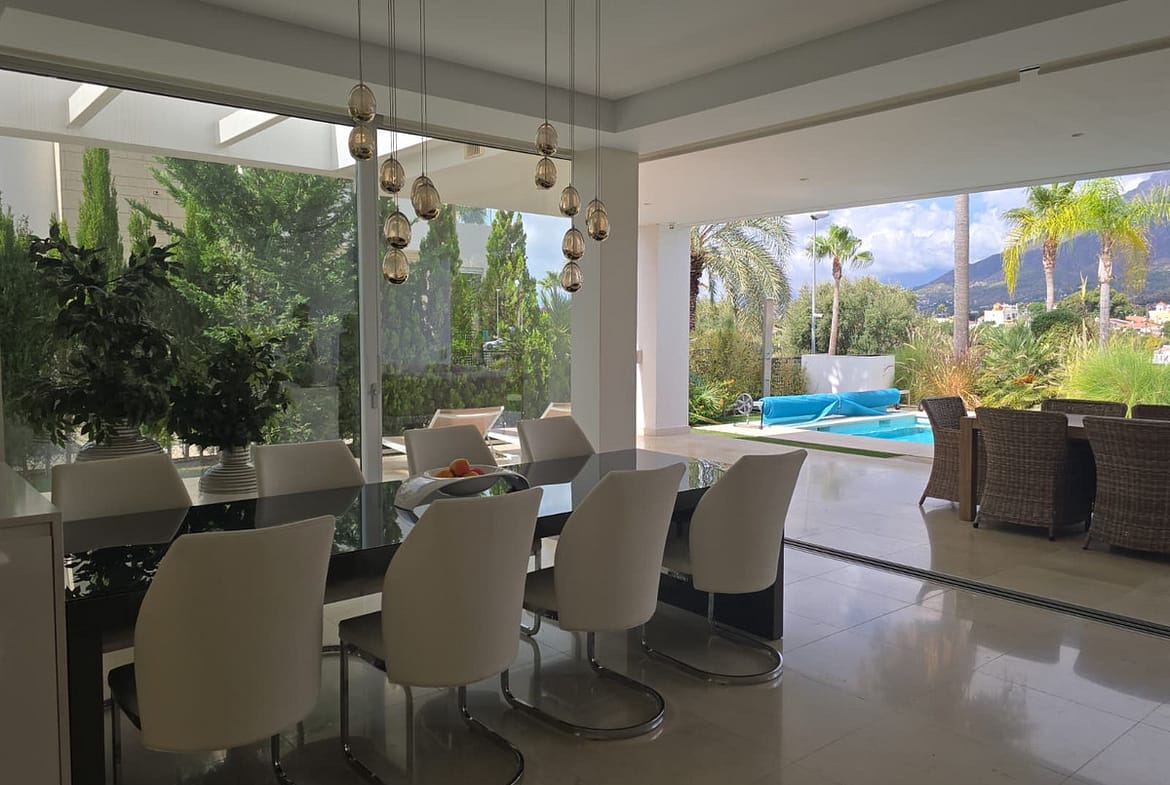 This luxurious modern villa is located in the residential community of Río Real “La Finca de Marbella”, 15 minutes walk from the beach (“Trocadero Arena” restaurant), 5 minutes by car from the center of Marbella and 15 minutes from Puerto Banús. The 3-bedroom villa is made up of two levels, 2 bedrooms on the second floor with a large terrace with spectacular mountain-, city- and partly sea views and 1 bedroom on the ground floor. Each room is equipped with elegant furniture and a private bathroom. The ground floor offers a large living and dining area connected to the open plan kitchen. The floor-to-ceiling windows allow the interior and exterior areas to be integrated, making it especially pleasant. The villa has its own private heated pool, closed private parking for 2 cars and tropical plants throughout the garden. Underfloor heating, air conditioning, alarm system and cameras, all for the comfort of living.