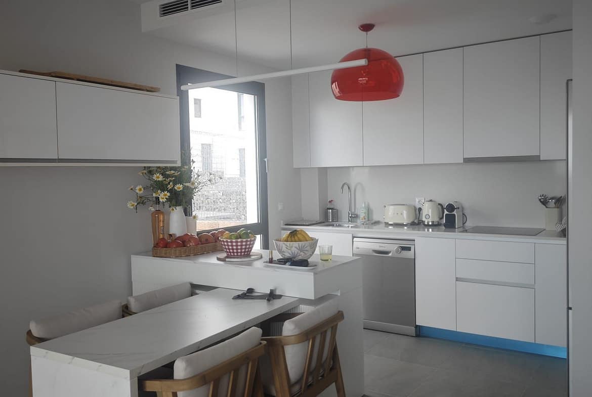 The lower level is designed for rest and relaxation and includes three spacious bedrooms and two beautifully finished bathrooms, including a master bedroom with an en-suite bathroom. Each bedroom has direct access to a spacious private garden of 190 m², creating a harmonious blend of indoor and outdoor space and allowing natural light to flood the space. The master bedroom even has partial sea views, adding to the luxury.
