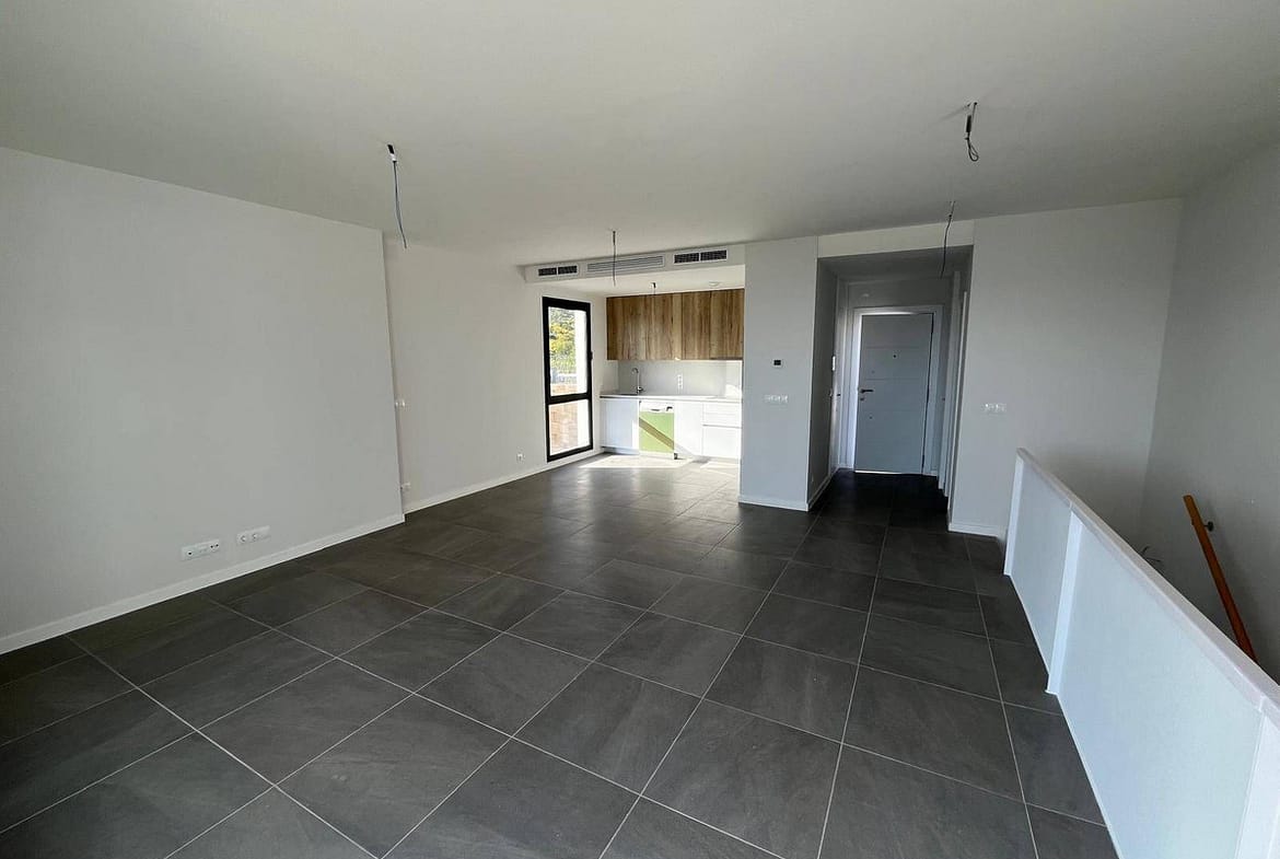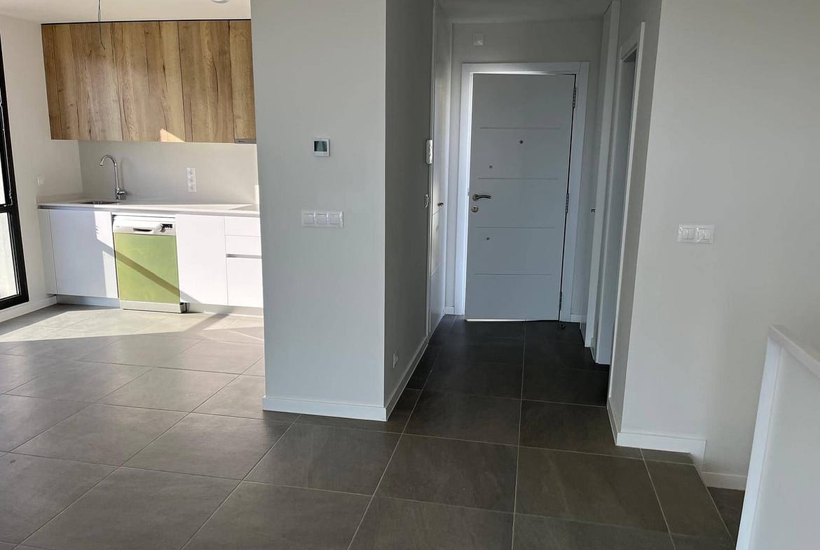 You enter the upper floor of the house, where you have an entrance hall and a guest toilet and then you go into the kitchen and living room and from the living room you have a partial view of the sea. In extension of the living room there is a 24m2 terrace that is south facing, so with lots of sun.