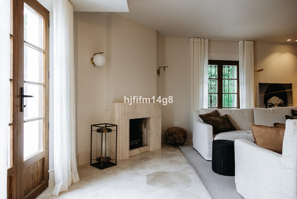 The main living area features a bright and inviting living room with an open-plan fireplace, perfect for cozy evenings, and direct access to a private, uncovered terrace ideal for outdoor dining and relaxation in the Marbella sunshine.