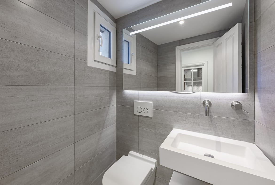 The fully fitted kitchen is very elegant and equipped with high-end appliances. A guest toilet completes this floor.