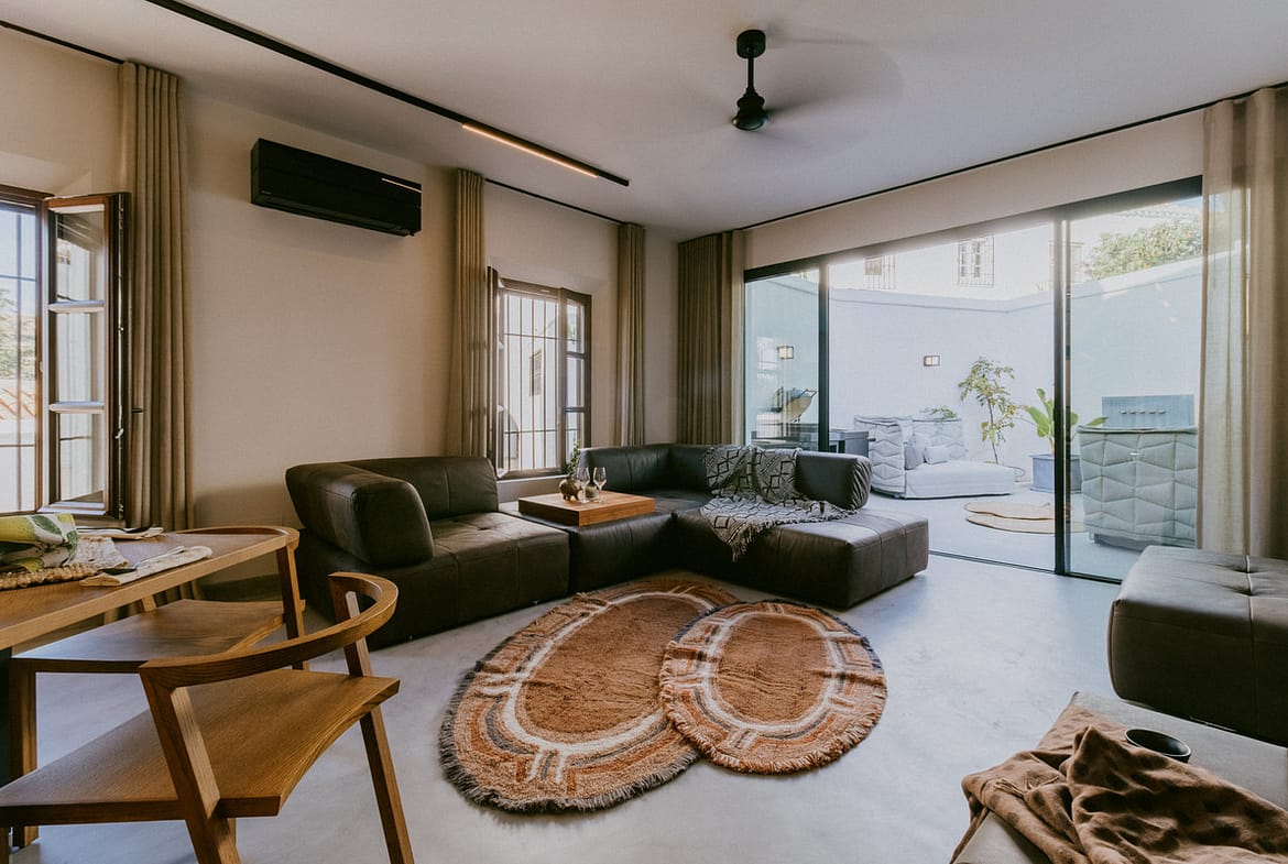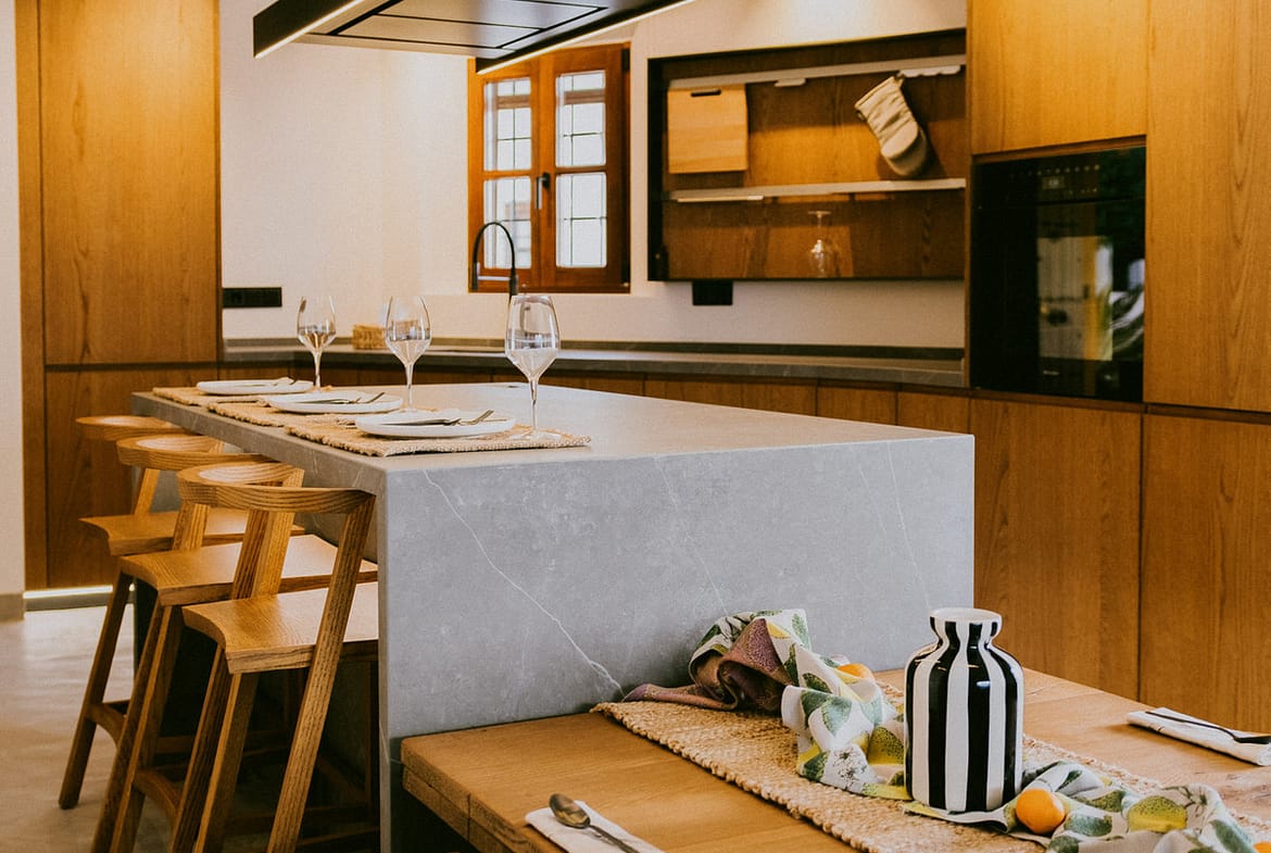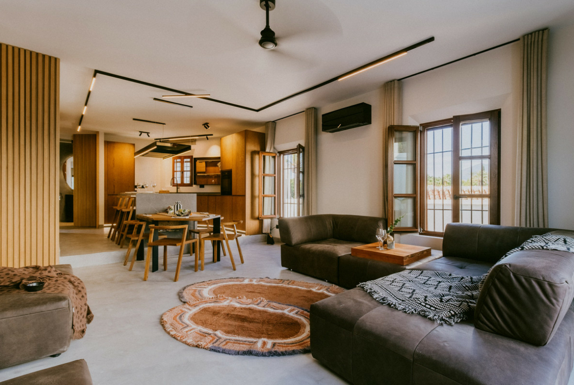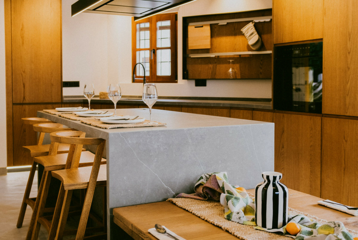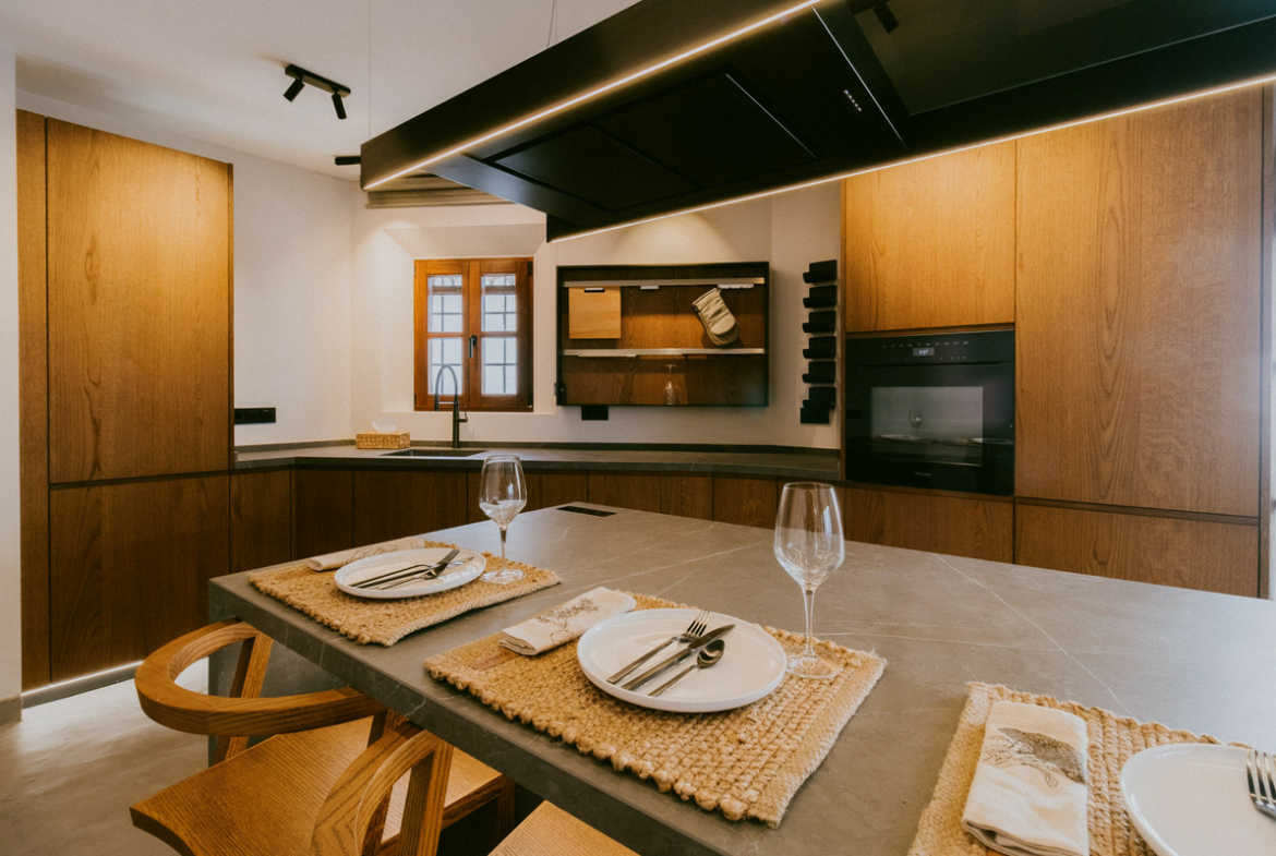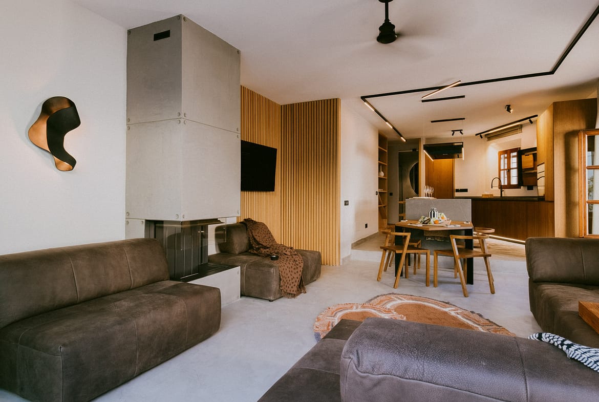 The open-plan living and dining area is bathed in natural light, providing a luxurious yet comfortable space with a real wood fireplace, perfect for relaxing or entertaining. Expansive glass doors lead to a private Andalusian-style patio, offering a serene retreat for outdoor relaxation.