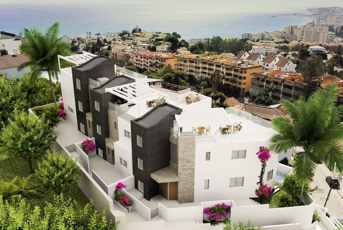 Each rooftop terrace offers panoramic views over Fuengirola Bay, the Mediterranean Sea, and the Mijas mountains, and can be customized with lounge areas, an outdoor kitchen, jacuzzi, or left minimal – entirely your choice.