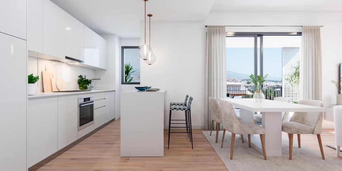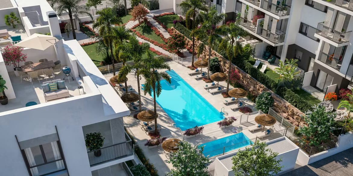 This development consists of 102 apartments and penthouses of 1, 2 and 3 bedrooms, with constructed areas of up to 102.75 m2, terraces of up to 97.36 m2 and gardens on the ground floor of up to 52.03 m2. It is a residential complex with the highest standards of architecture, energy saving and sustainability, which also has privileged common areas such as its gardens, its two swimming pools, the children’s play area, the barbecue area or the coworking space. All units include underground parking and some of the units will also have a storage room.