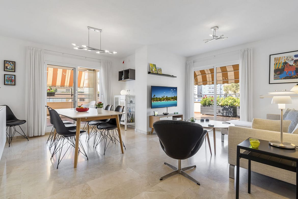 Bright living room with sofa and dining area, opening directly onto the main terrace from the two different terrace-doors.