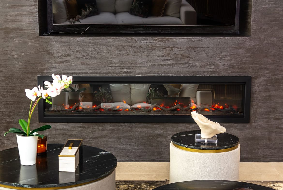 Living Room: Expansive and light-filled with floor-to-ceiling glass doors opening onto the terrace. Generous lounge and dining areas designed for refined entertaining and relaxed living. Place built furniture and gas fireplace.
