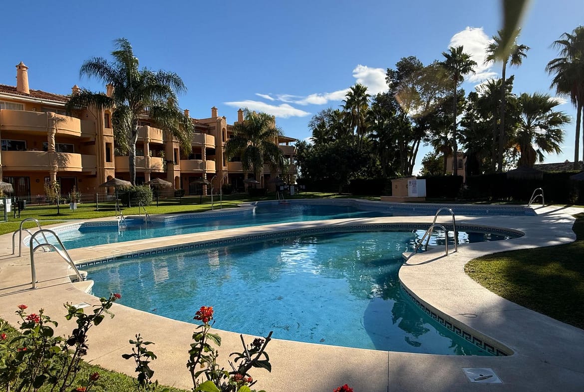 This beautiful corner ground-floor apartment is nestled within the gated and meticulously maintained El Porton 7 complex in Calahonda, Mijas Costa. The property enjoys a bright and airy atmosphere, with direct access to a large swimming pool set amidst lush gardens filled with tropical trees—a perfect oasis for relaxation.