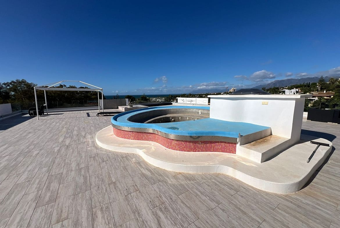 the apartment has either room or has 5 bedrooms with the top floor opening out onto this vast roof area. one of which has a 16 person built jacuzzi
