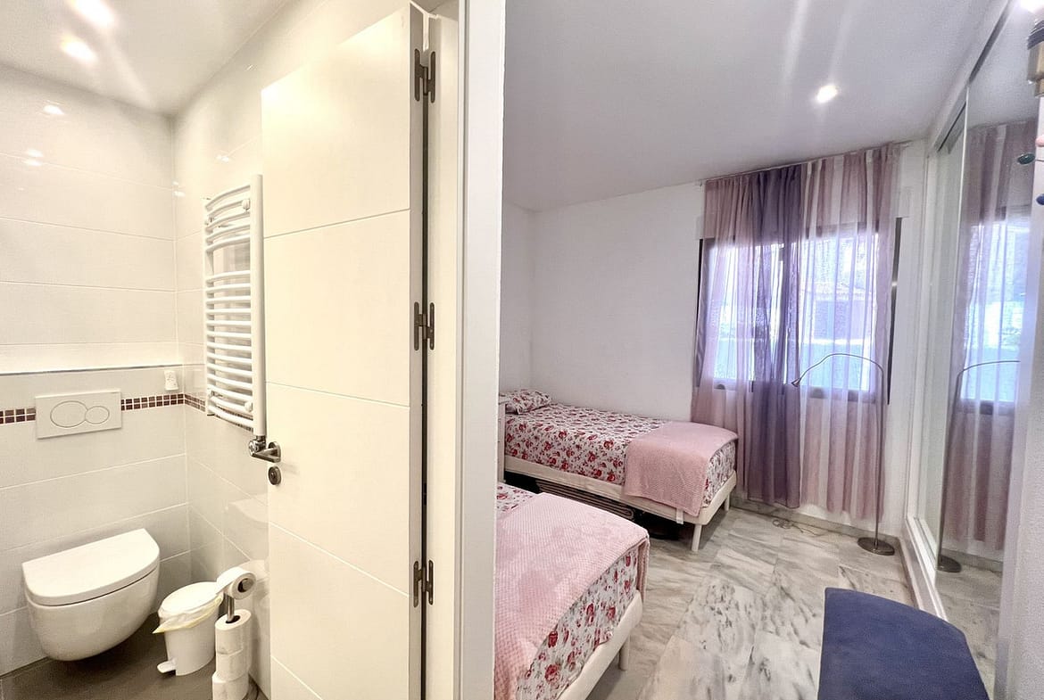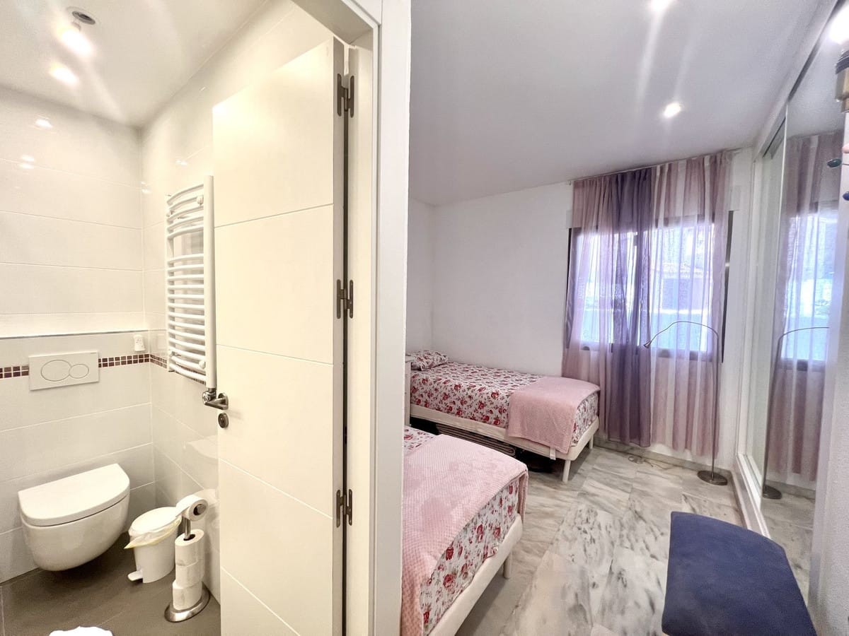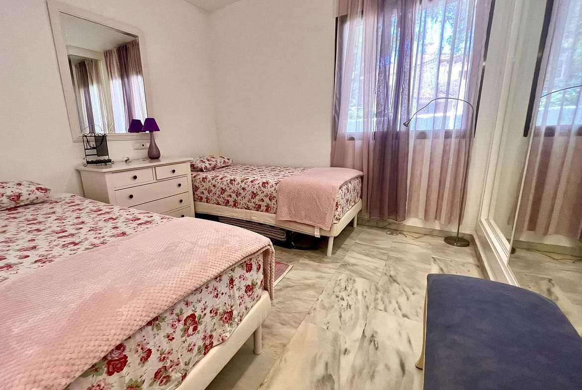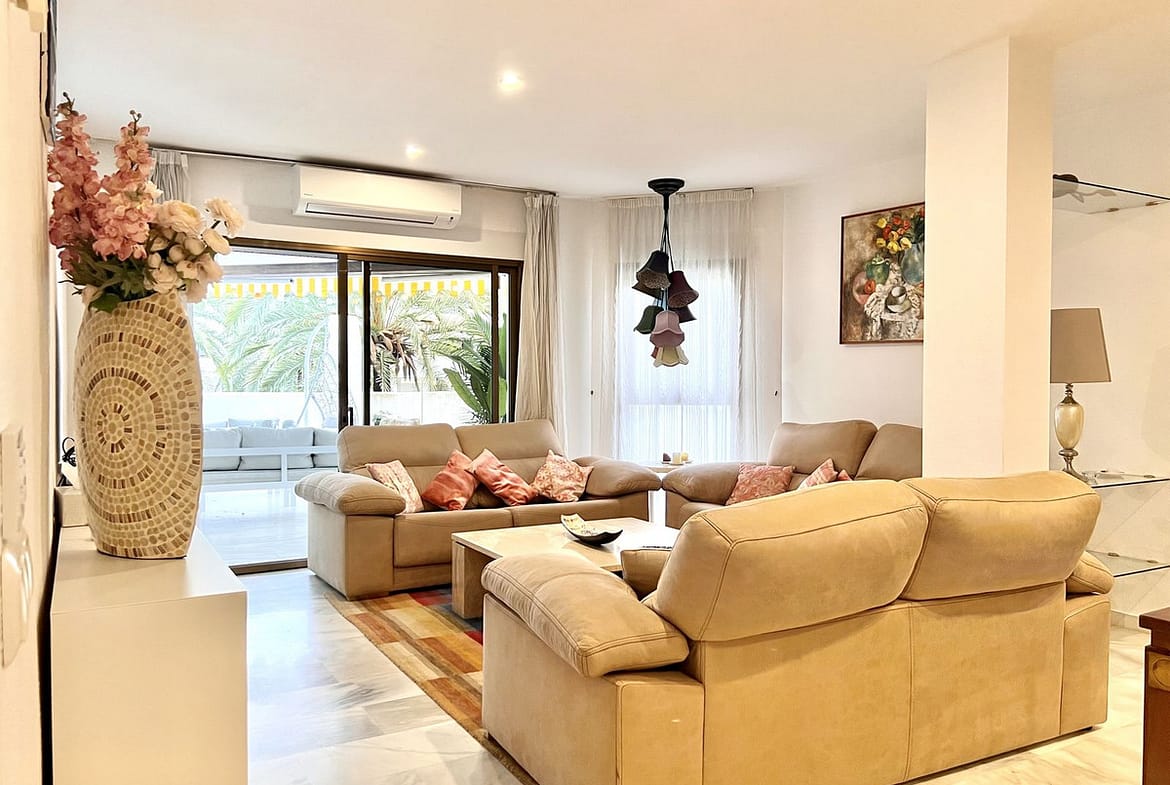 Ideal holiday acommodation for families!! Spacious 4 bedroom 4 bathroom elevated groundfloor apartment located only 1 min walk to the best beaches in Marbella. This open plan apartment is fully equipped with everything you need for a perfect holiday and it has a large terrace.