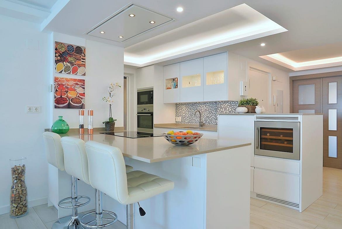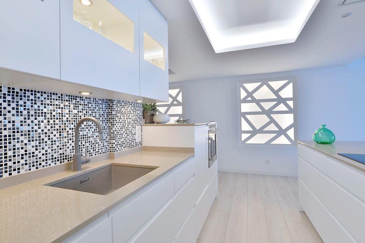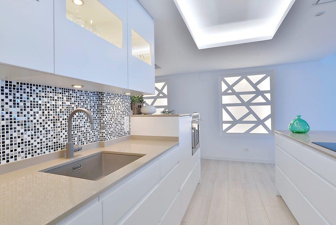 The apartment has been meticulously renovated to the highest Scandinavian standards, featuring fully foldable double windows that open up to the front terrace. With hot and cold AC split into five individually regulated zones, comfort is guaranteed in every room. The kitchen is a chef's dream, furnished with high-end Scandinavian style units from Nordic Muebles, and equipped with top-of-the-line Electrolux appliances and stunning Sillestone worktops. The induction stove caters to all culinary needs, all complemented by an automated ceiling-integrated fan. Additionally, the kitchen boasts an integrated wine cooler and a spacious American fridge with double doors and sliding freezer drawers.
