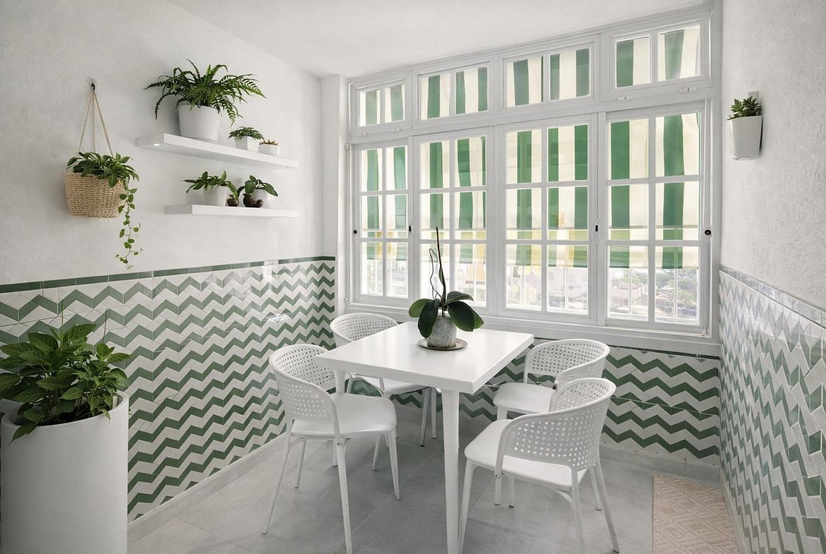 The property features a spacious and bright living-dining room equipped with air conditioning, perfect for relaxing with family or entertaining guests. From here, you access a charming enclosed terrace, a versatile space that can be enjoyed all year round, adding extra natural light and living area.