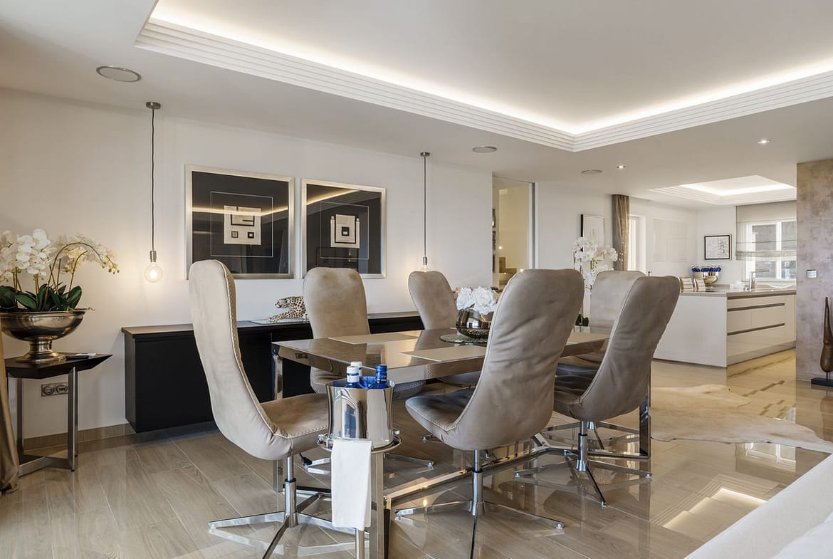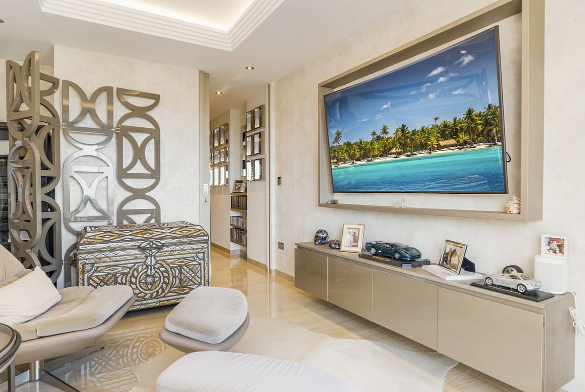 The upper floor is dedicated to the impressive master suite featuring his-and-hers bathrooms, a large dressing area and direct access to a private terrace, together with a further guest bedroom en suite. Above, the solarium has been designed for ultimate relaxation and wellness, offering a gym, sauna, steam room, jacuzzi and a stylish chill-out area.