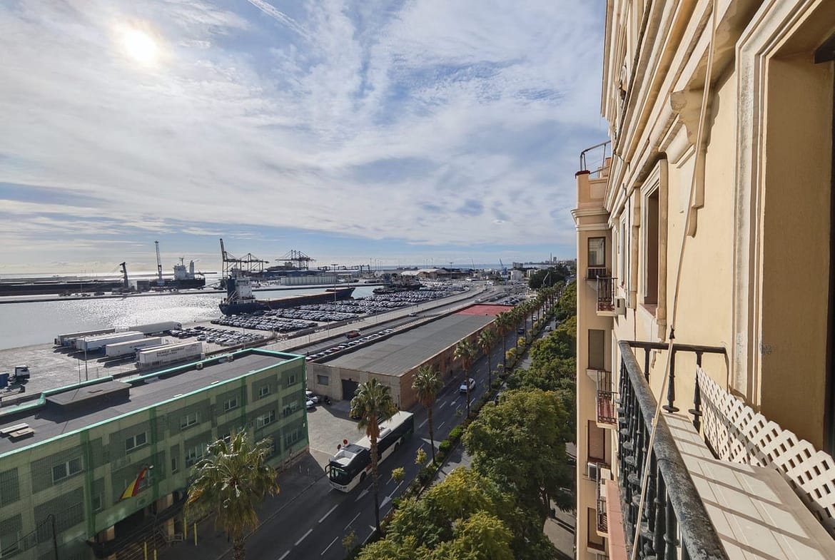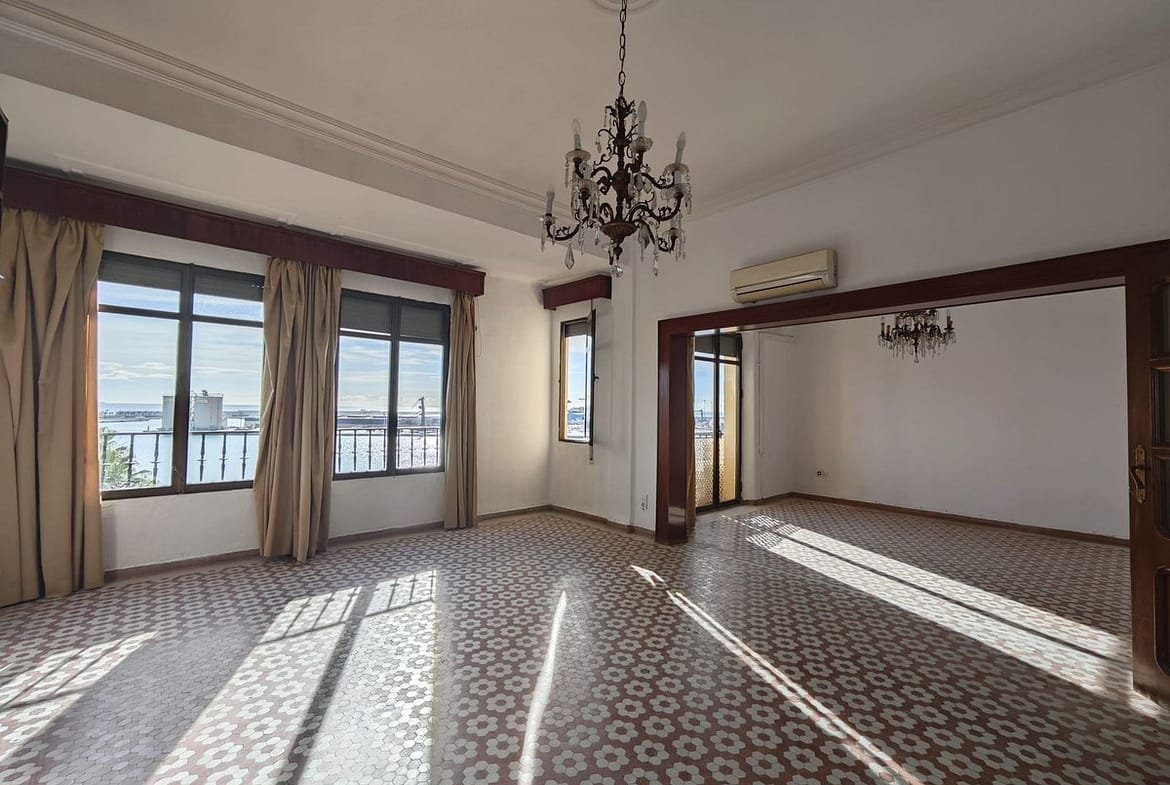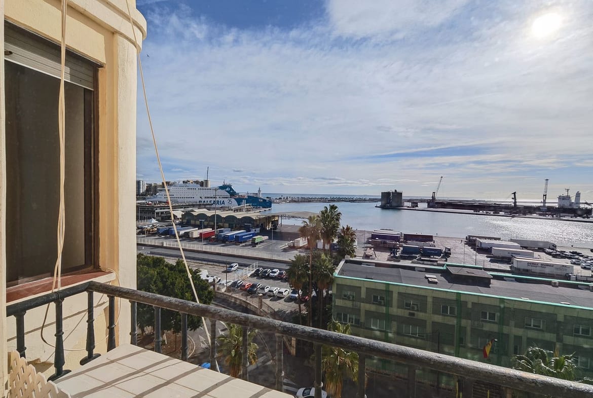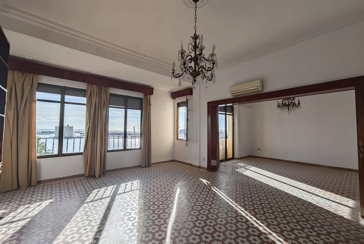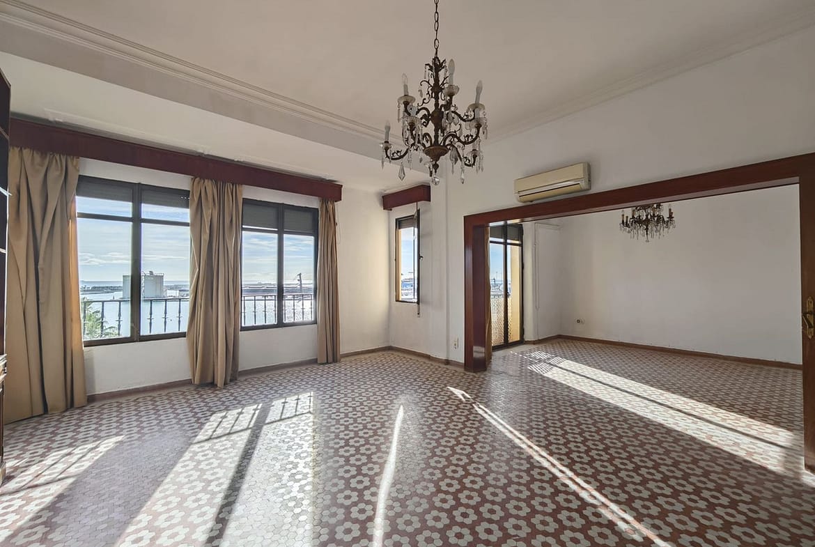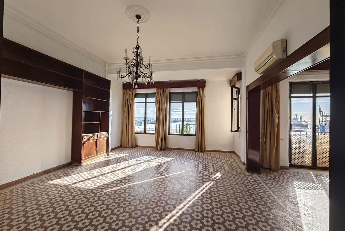 spectacular stately home with large windows and open views of the port of Malaga. Located in one of the prime areas of Malaga, this property stands out for its elegance and enormous potential for renovation. It retains its original charm, with a beautiful hydraulic floor in perfect condition, high ceilings, moldings, large windows and views of the Mediterranean Sea.