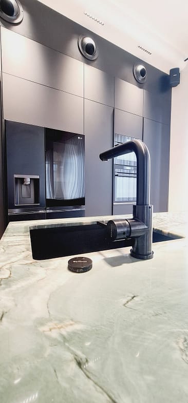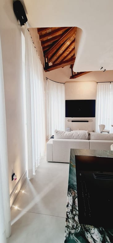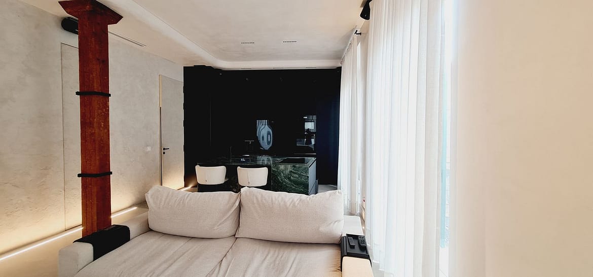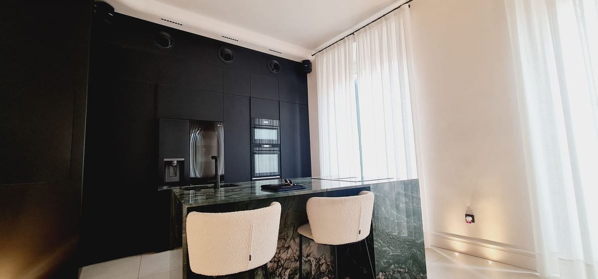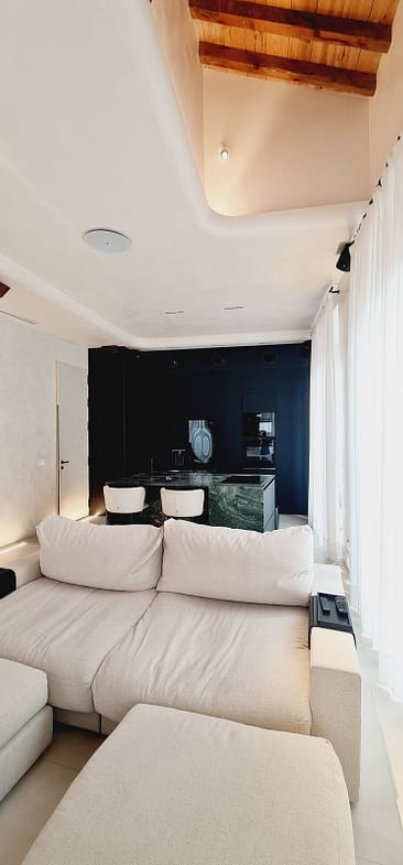 Open-plan American kitchen, spacious living room, large walk-in closet