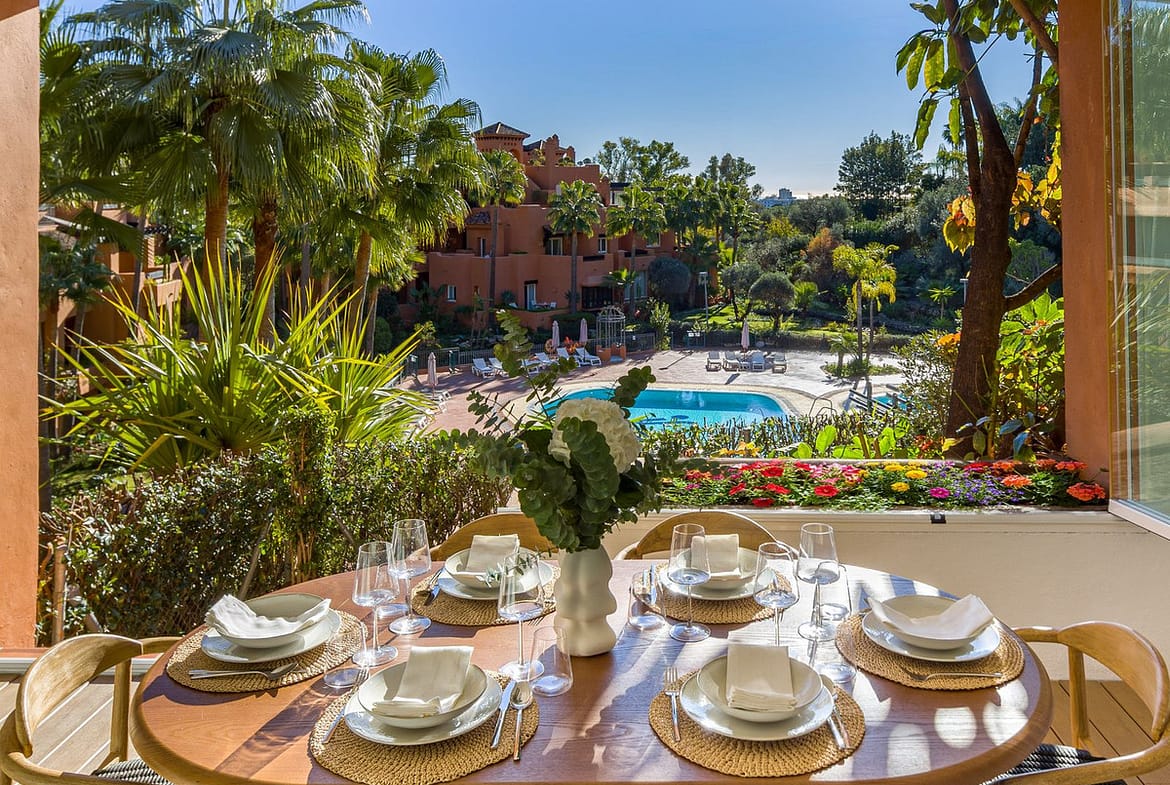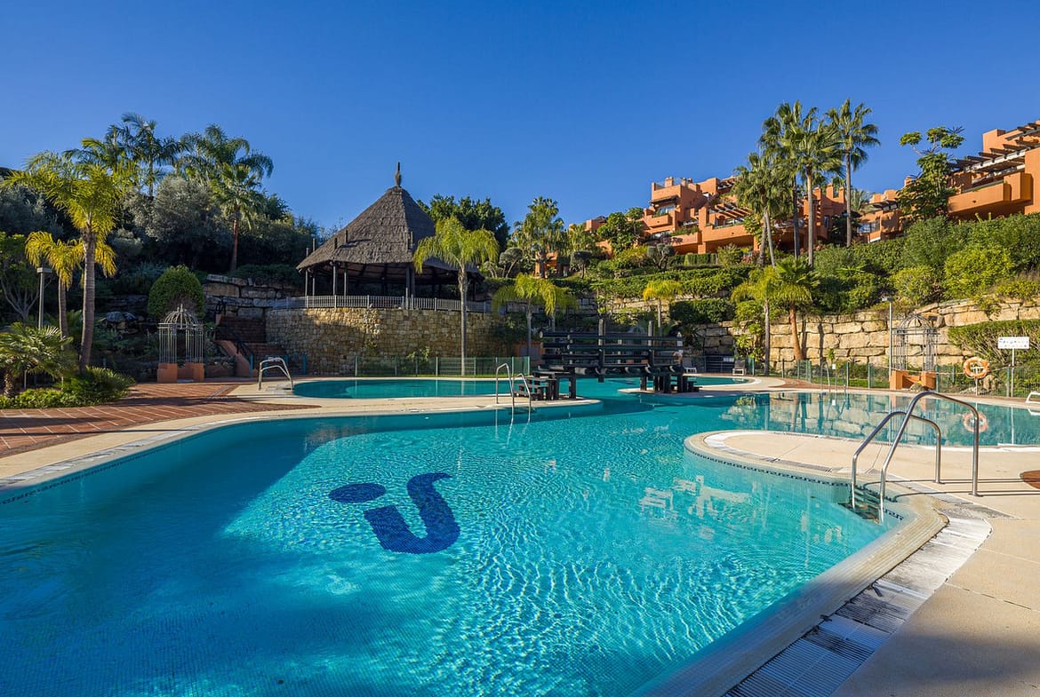 is a magnificent luxury residential complex located in La Cerquilla, one of the most exclusive and sought-after areas within the prestigious district of Nueva Andalucía, nestled between the renowned golf courses Las Brisas and Los Naranjos. The complex stands out for its impressive oasis-like appearance, featuring beautifully landscaped gardens that complement the elegant Mediterranean architecture, perfectly blending with the lush Andalusian hills overlooking the famous Golf Valley.