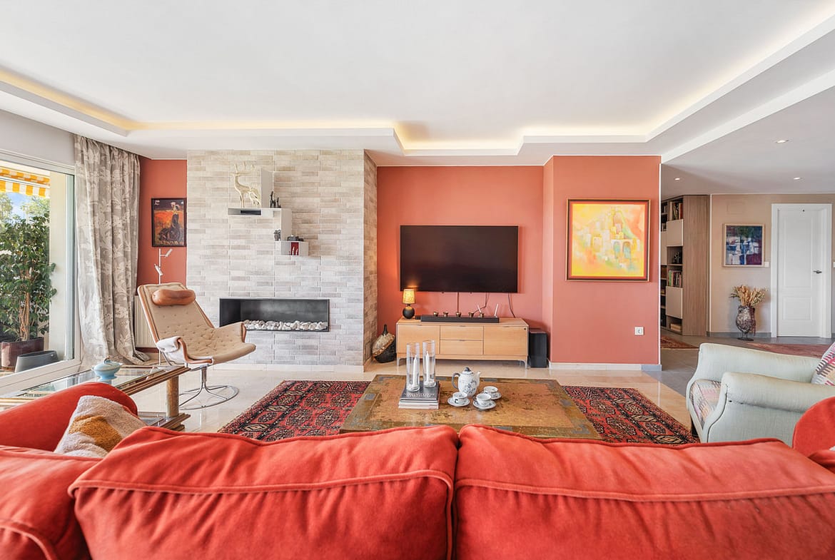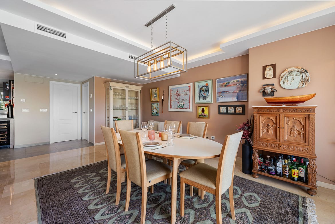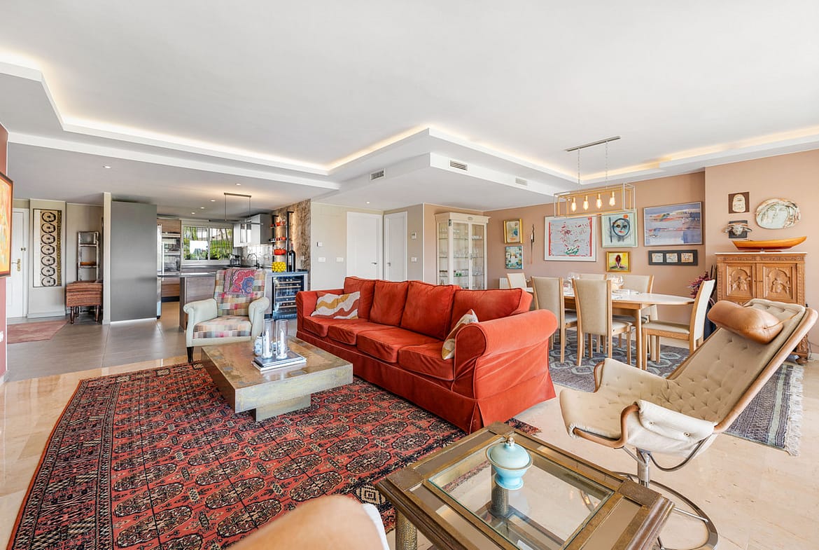 The bright and expansive living and dining area flows seamlessly onto a generous south-facing terrace, ideal for outdoor dining and relaxation. On this side of the apartment, you will also find a stylish guest bedroom and bathroom.