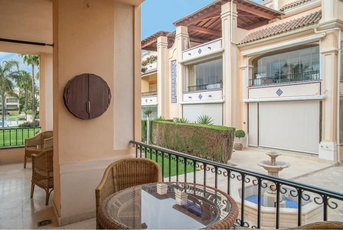 Luxurious 4 bedroom ground floor apartment situated within a deluxe complex in the Golden Mile, boasting swimming pools, fountains, manicured lawns and 24 hours security service. It is right next to “Le Village” shopping centre with supermarket, gymnasium, bars and restaurants, Le Roche hotel management school and within easy reach to the ‘Manolo Santana’ Tennis Club, Aloha College, Puente Romano Hotel, the beach, Puerto Banús and Marbella centre.