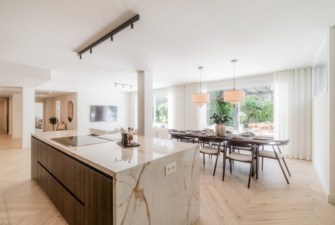 This luxurious 4-bedroom ground floor apartment is located in the heart of Marbella’s Golden Mile, offering the blend of apartment and villa living. The property spans a total of 470 m², including 229 m² of built space and a large 241 m² private garden. The living spaces are designed for comfort and luxury, with large windows connecting the indoor areas with the large private outdoor garden, creating a natural light throughout the apartment.