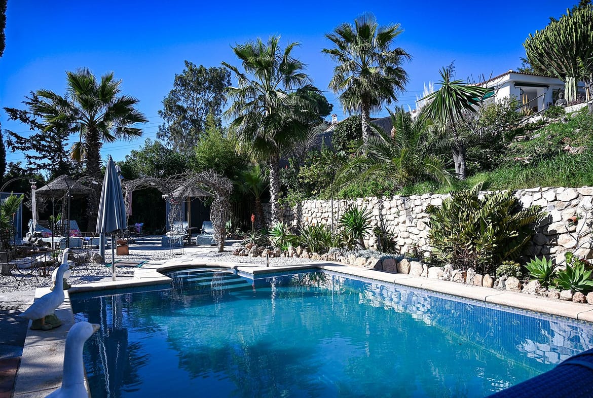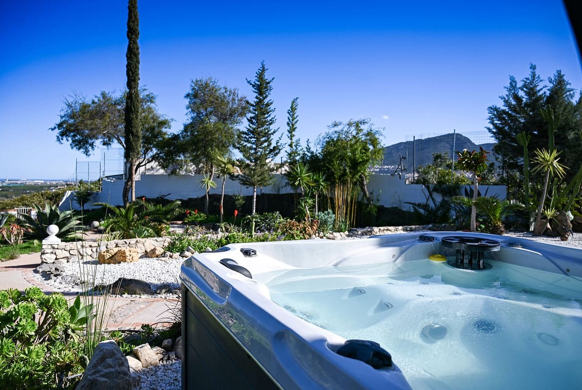 Outside, the property truly becomes a private Mediterranean retreat. A beautiful swimming pool, outdoor kitchen, solar-powered outdoor shower, and included 5-seat jacuzzi create a space designed for relaxation and entertaining. The landscaped garden, filled with fruit trees and equipped with automatic irrigation, enhances the sense of tranquility and connection to nature, while multiple terraces and outdoor areas allow you to enjoy the sun and views at any time of day.