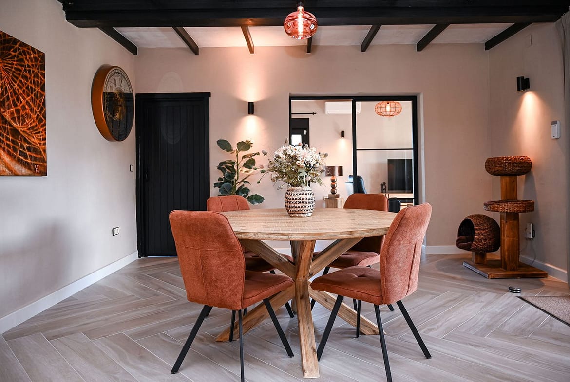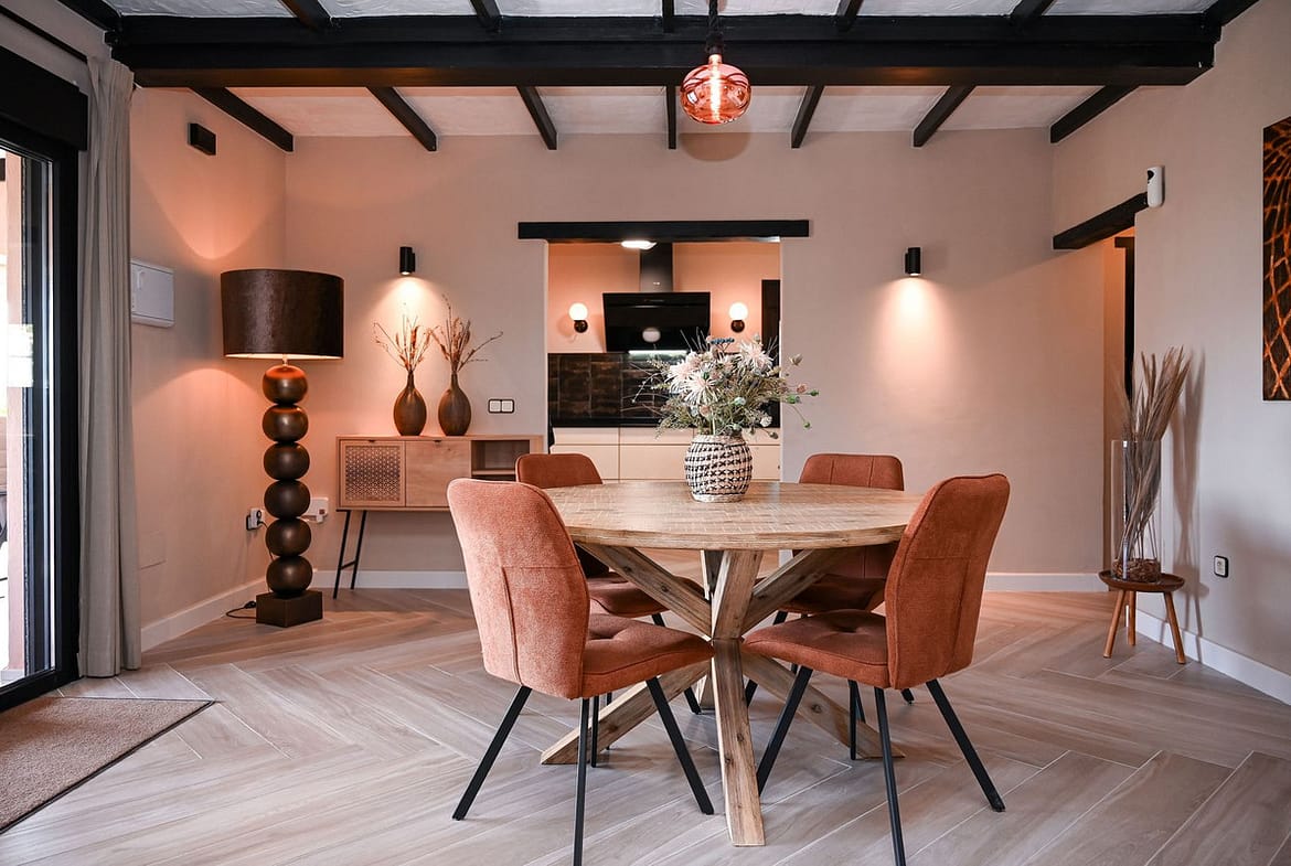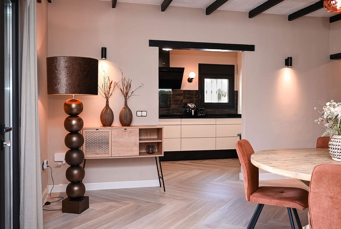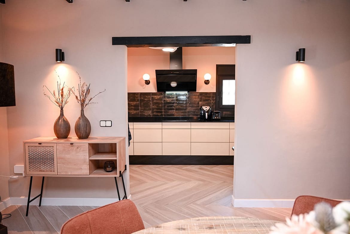 The main house has been thoughtfully designed to create bright, open living spaces that flow naturally between indoors and outdoors. The open-plan kitchen and dining area form the heart of the home, complemented by a spacious living room that can also serve as an additional bedroom if needed. Two generous bedrooms and two fully renovated bathrooms offer both comfort and luxury, featuring underfloor heating, wall-hung toilets, and premium Hansgrohe fittings. Large covered porches extend the living space outdoors, creating the perfect setting to relax, entertain, or simply enjoy the peaceful surroundings.