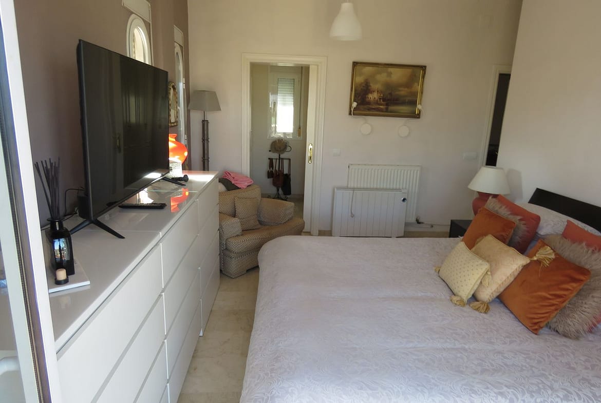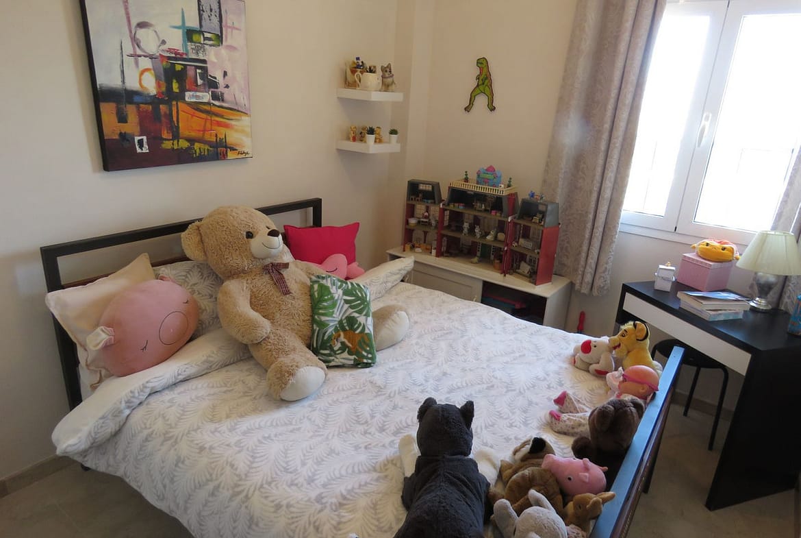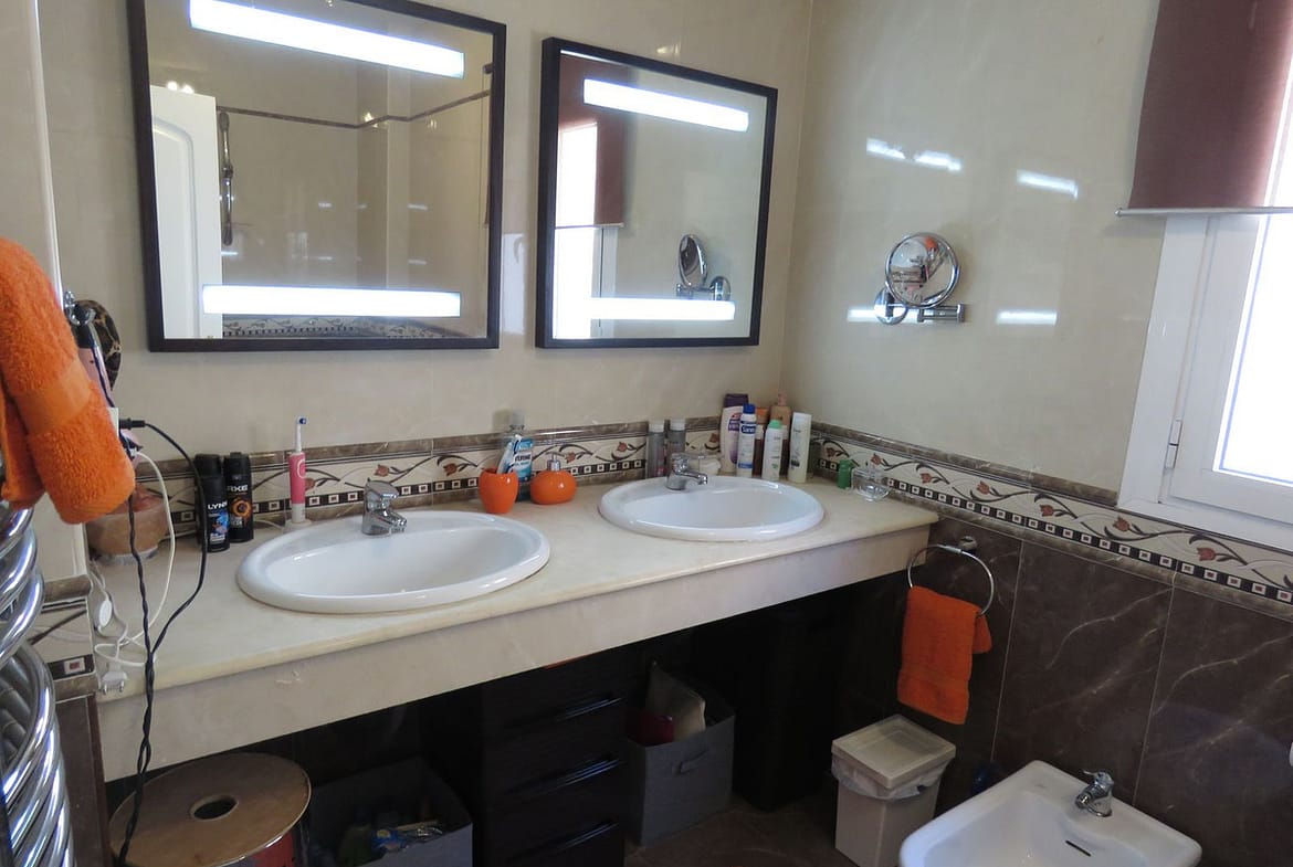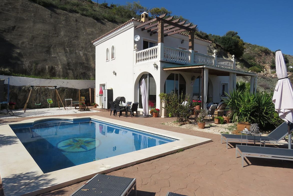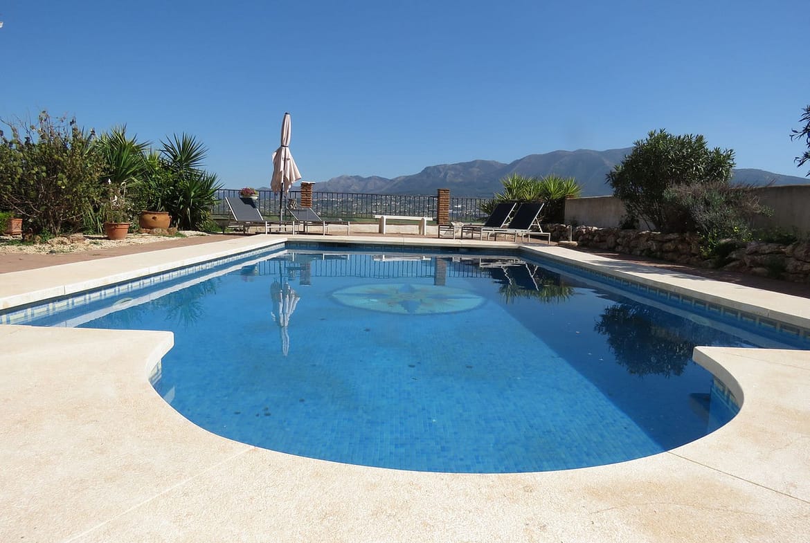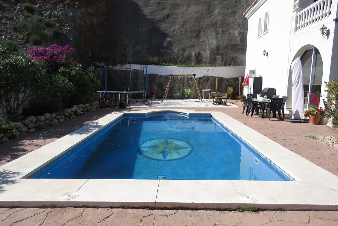 Great house with amazing mountain views. The property consists of 4 bedrooms and 3 bathrooms of which1 bedroom and bathroom is on the main level, the other 3 bedrooms and 2 bathrooms are on the 1st floor. The master bedroom comes with en-suite bathroom and leads out onto a nice sized terrace with incredible open views of the countryside. It has its own private swimming pool, BBQ area and children's playground. The outdoor space is tiled and easily maintained. Furthermore there is a large two car garage. Must be seen to appreciate and well worth viewing !!!
