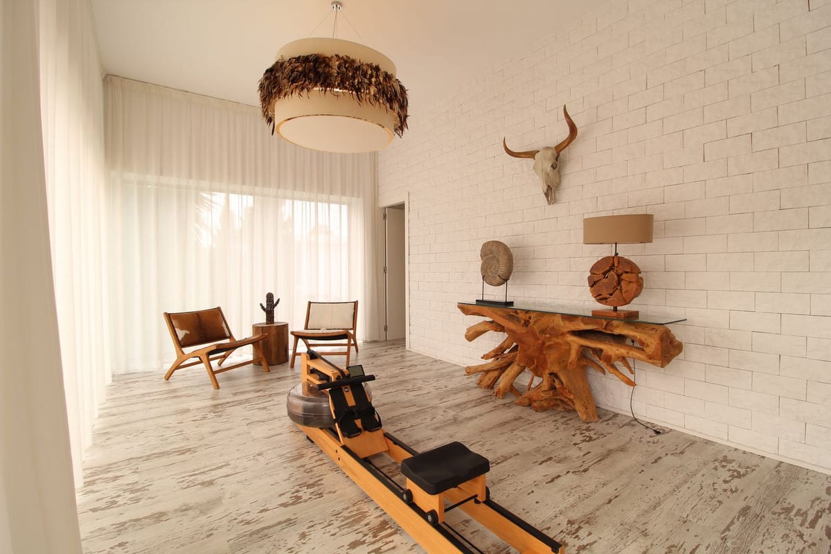 As you enter the welcoming hallway, you are immediately struck by the sense of openness, with the living area unfolding before you. To your left, the beautifully designed open kitchen exudes a natural Ibizan charm, a theme echoed throughout the villa.
