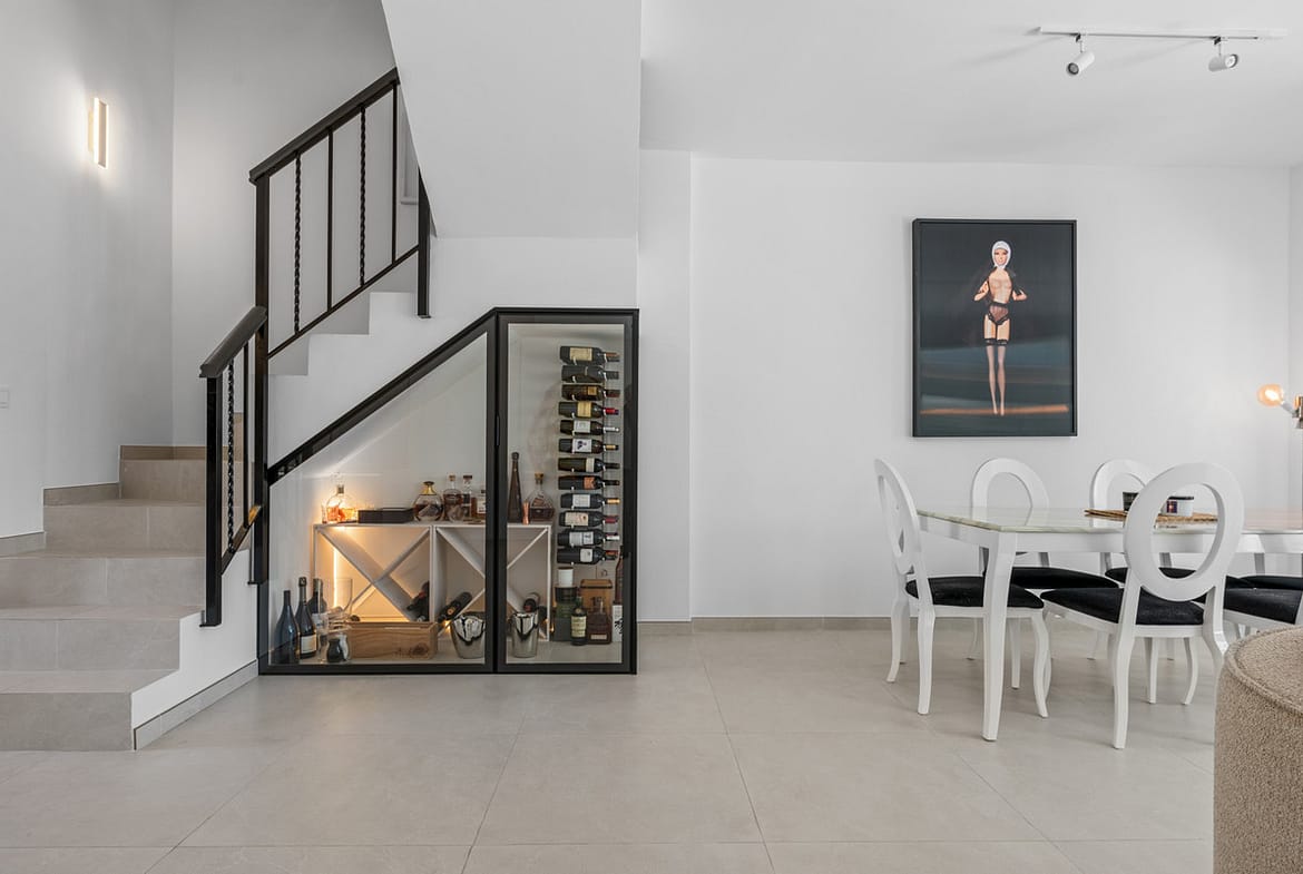 The ground floor features an elegant entrance hall, guest cloakroom, and a charming wine bodega. A spacious, fully fitted open-plan kitchen flows effortlessly into a bright and expansive living and dining area, with double doors opening onto a generous terrace. This leads to a beautifully landscaped garden with a private swimming pool, ideal for outdoor living and entertaining.