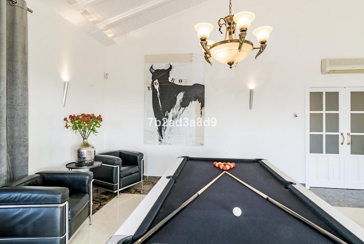 You find a large hall with high ceilings and magnificent entrance. 1 guest toilet. 2 bedrooms with 180cm x 200cm beds plus 1 bathroom. Large living room with fireplace and pool table. From the living room you have direct access to the covered terrace with several living areas and fantastic views. It has a large pool, sun deck and lovely garden with hot Jacuzzi.