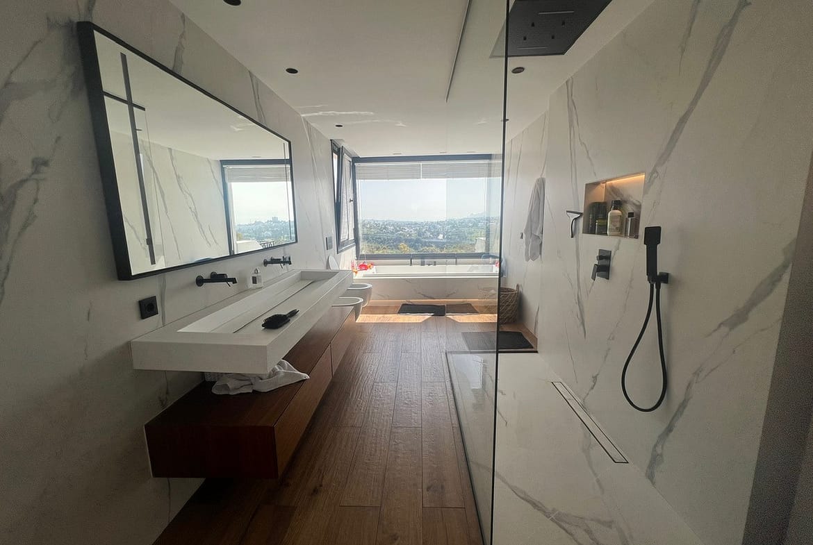 The first floor hosts three elegant en-suite bedrooms, two with private terraces. The top-level master suite is a private retreat, complete with a luxurious en-suite bathroom featuring a rain shower and freestanding bathtub overlooking panoramic views.