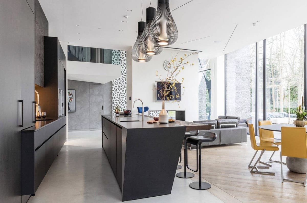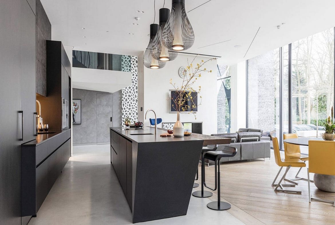 Ground floor; double-height entrance hall, lift, guest toilet, large living/dining area with an open-plan kitchen, laundry room, shoe dressing, and office space that can be converted in a bedroom with bathroom.
