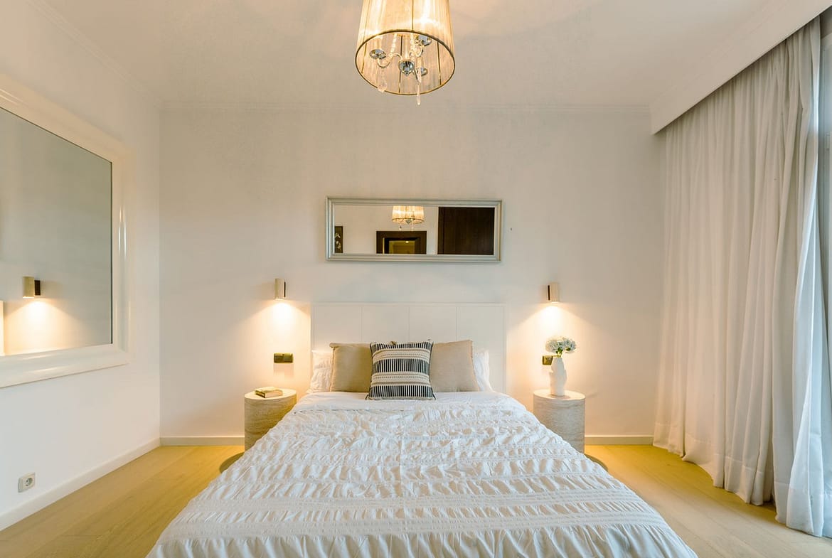 The master suite is a sanctuary of tranquillity, featuring floor-to-ceiling picture windows, direct access to the terrace and garden, a fully fitted dressing room, and a luxurious en-suite bathroom complete with a freestanding bath, walk-in shower, and double vanity, finished with handcrafted details by Belgian artisans.