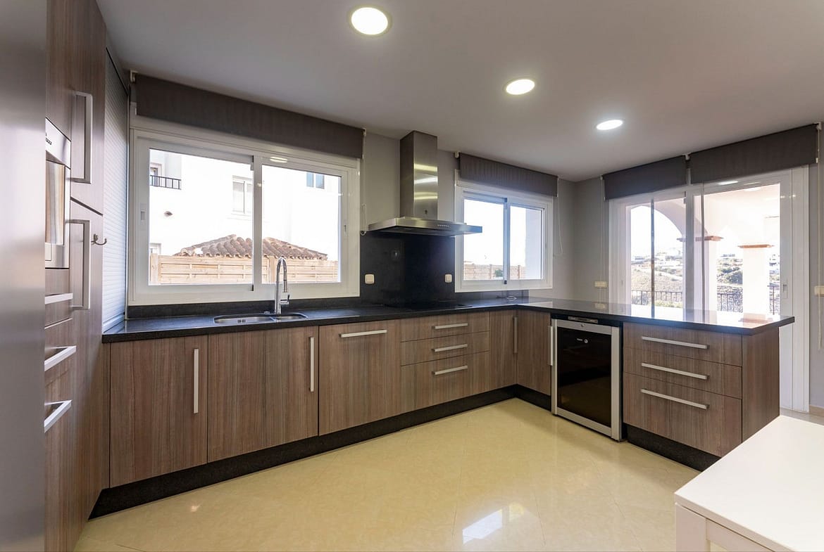 This generous villa features 4 bedrooms and 3 bathrooms, including an en suite with a jacuzzi bath. The interiors are finished with neutral décor and marble flooring throughout, fitted wardrobes, and dual-zone air conditioning for year-round comfort. The modern kitchen provides direct access to a covered terrace, ideal for al fresco dining, while the spacious living room is flooded with natural light, creating a warm and inviting atmosphere.