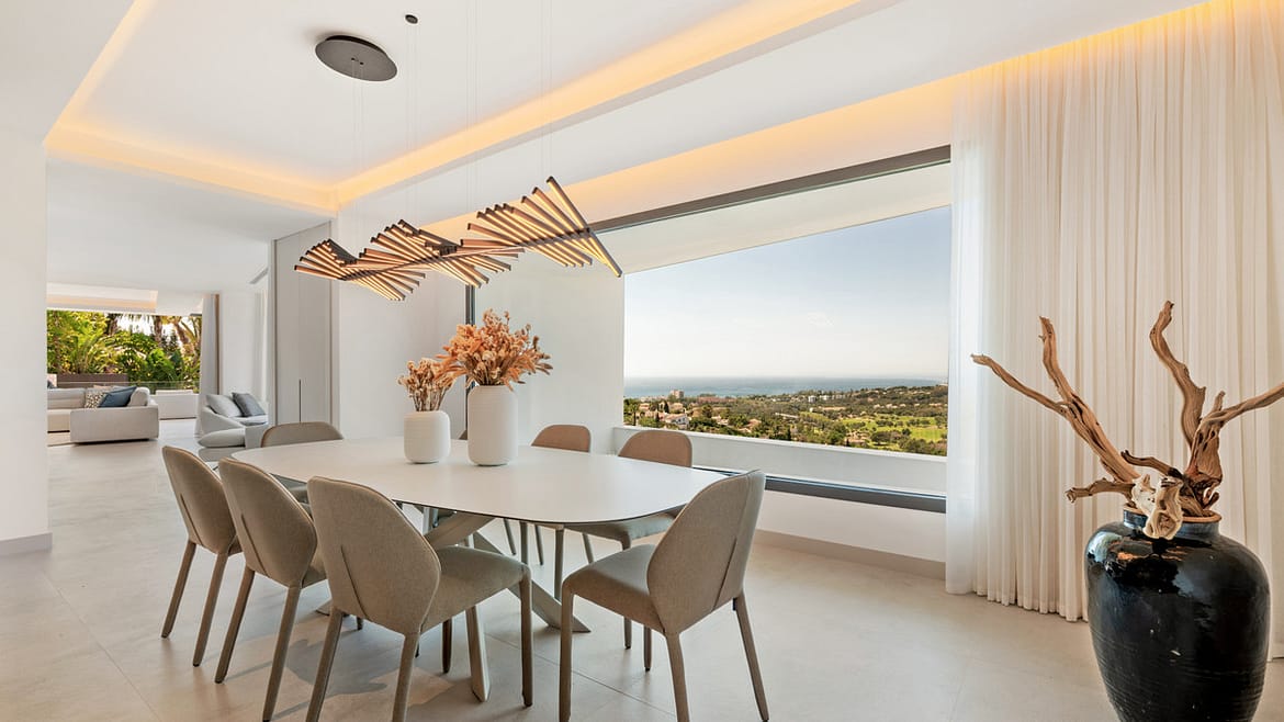 Inside, the villa is finished to a high standard with elegant stone surfaces, warm wood cabinetry and discreet lighting. Generous bedrooms include stunning ensuite bathrooms, while the master suite offers direct terrace access and panoramic sea views. With its modern design, private setting and exceptional vistas, El Rosario 430 is a standout contemporary home in Marbella East.