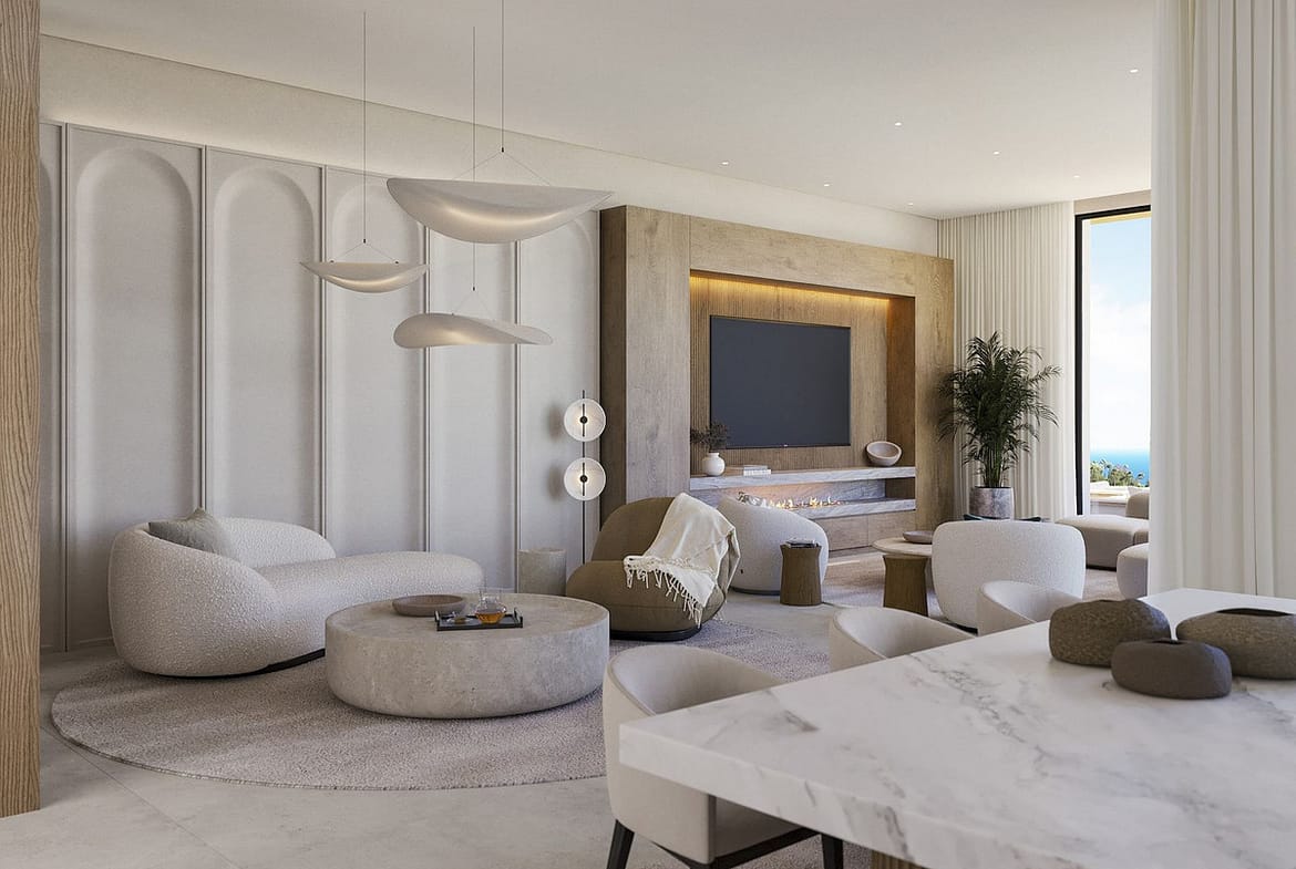 Descending further, the open-plan living area and state-of-the-art kitchen unfold beneath 3.5-meter-high ceilings, creating an airy, light-filled space that embodies the Mediterranean lifestyle at its finest.