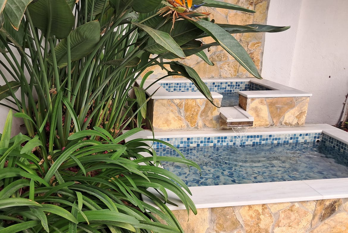 The ground floor is designed for daily and social living: a fully renovated kitchen with quality cabinetry and soft-close fittings, a large living-dining room with fireplace and air conditioning, a guest toilet, and a practical storage/laundry area. The exterior is another of its great attractions: a private 118 m² garden with a relaxing water feature, a covered porch with barbecue—an ideal space for outdoor gatherings.