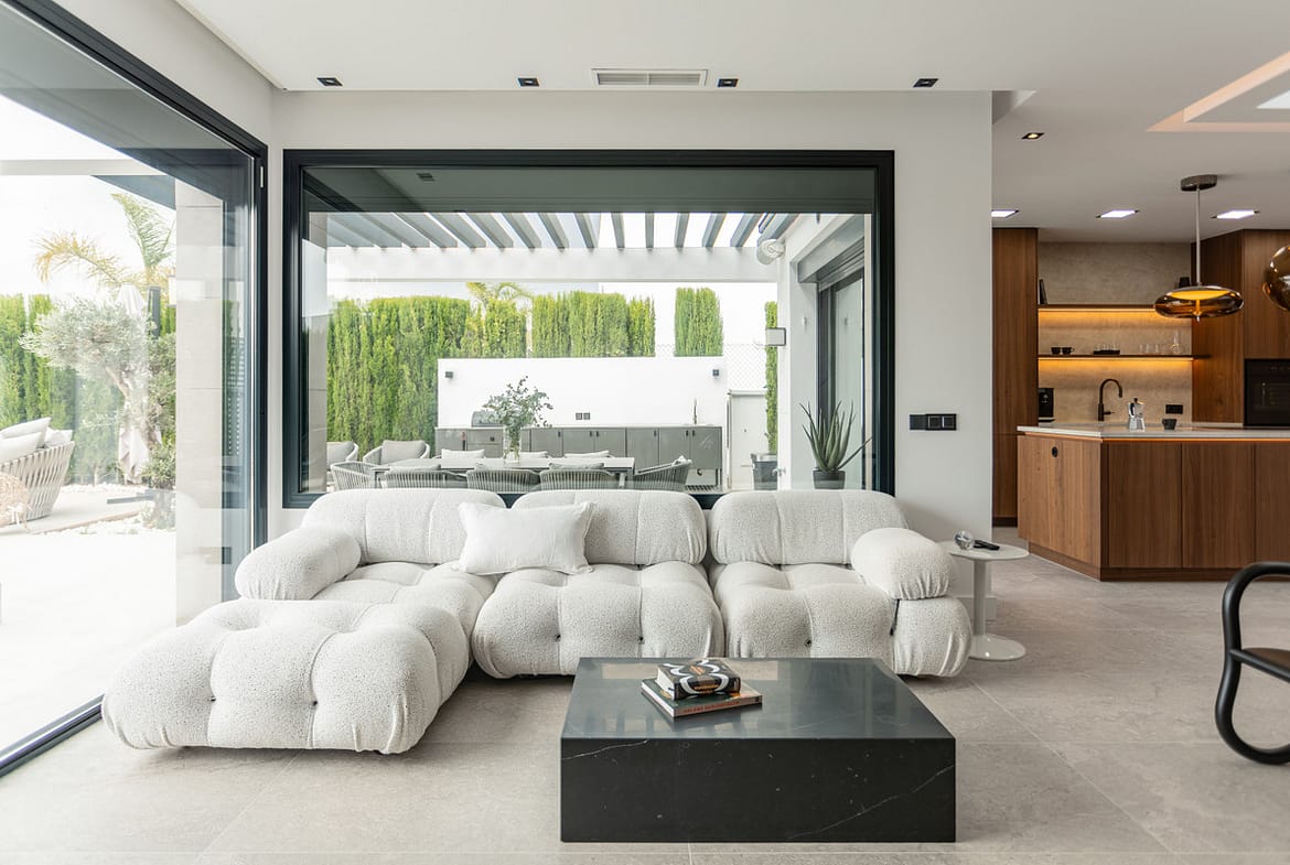 The outdoor terrace of 190m² is designed to maximize the villa’s privileged setting. It features a heated infinity pool, a fully equipped barbecue area, a shaded pergola for al fresco dining, and a comfortable chill-out space—all with breathtaking views over the sea and the African coastline. The villa features a beautifully landscaped garden with an automatic irrigation system, located directly in front of the pool area. Mature trees and well-established plants create a lush, serene environment, offering both privacy and natural beauty throughout the year.